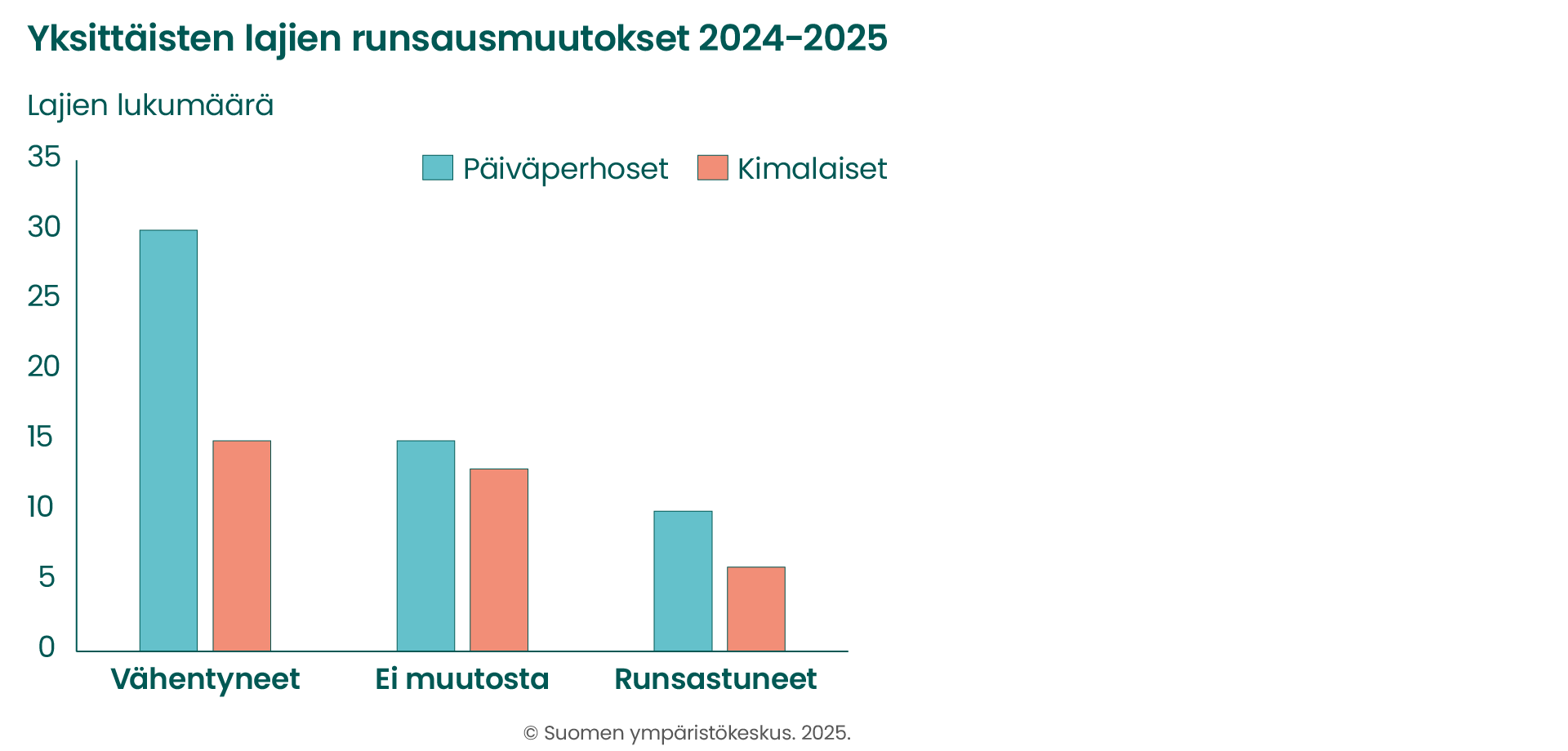 Ennakkotietojen perusteella vähentyneitä päiväperhoslajeja on tänä kesänä ollut selvästi enemmän kuin runsastuneita. Noin kolmanneksella lajeista yksilömäärät olivat lähellä edellisvuoden tasoa. Päiväperhosten kokonaismäärä laski kuitenkin vain 13 prosenttia, koska muutamat yleisimmistä lajeista runsastuivat.