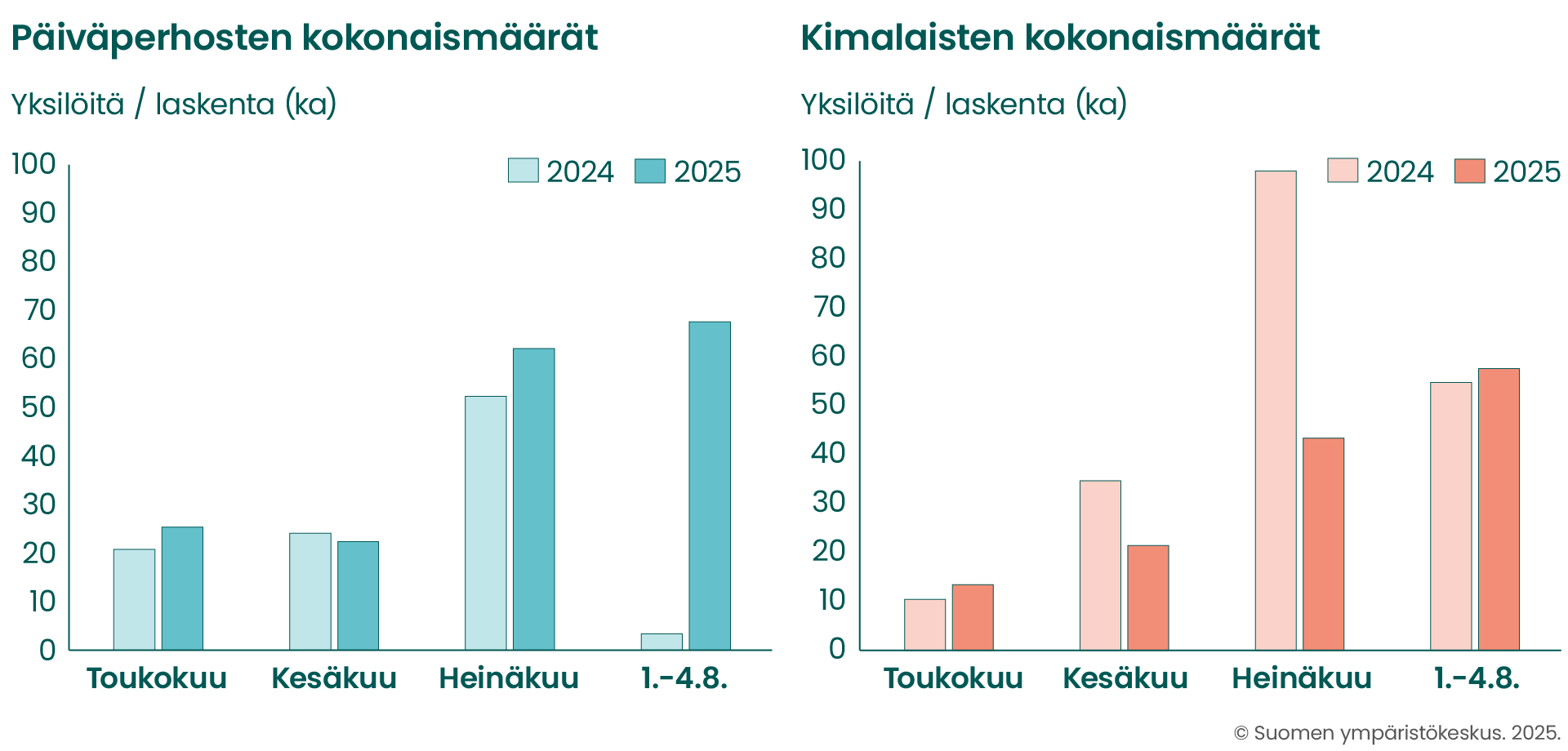Päiväperhosten ja kimalaisten runsaustiedot perustuvat Suomen ympäristökeskuksen ylläpitämiin Maatalousympäristön päiväperhosseurantaan sekä kimalaisseurantaan. Molemmat seurannat perustuvat vapaaehtoisten havainnoijien työhön. Tässä esitetyt arviot perustuvat 4.8. mennessä tallennettuihin havaintoaineistoihin, jotka vastaavat yli puolta kesän havaintomäärästä. Lopulliset arviot saadaan vuodenvaihteessa. Ne tarkentavat arvioita etenkin loppukesän lajien osalta, joiden lento on edelleen käynnissä.