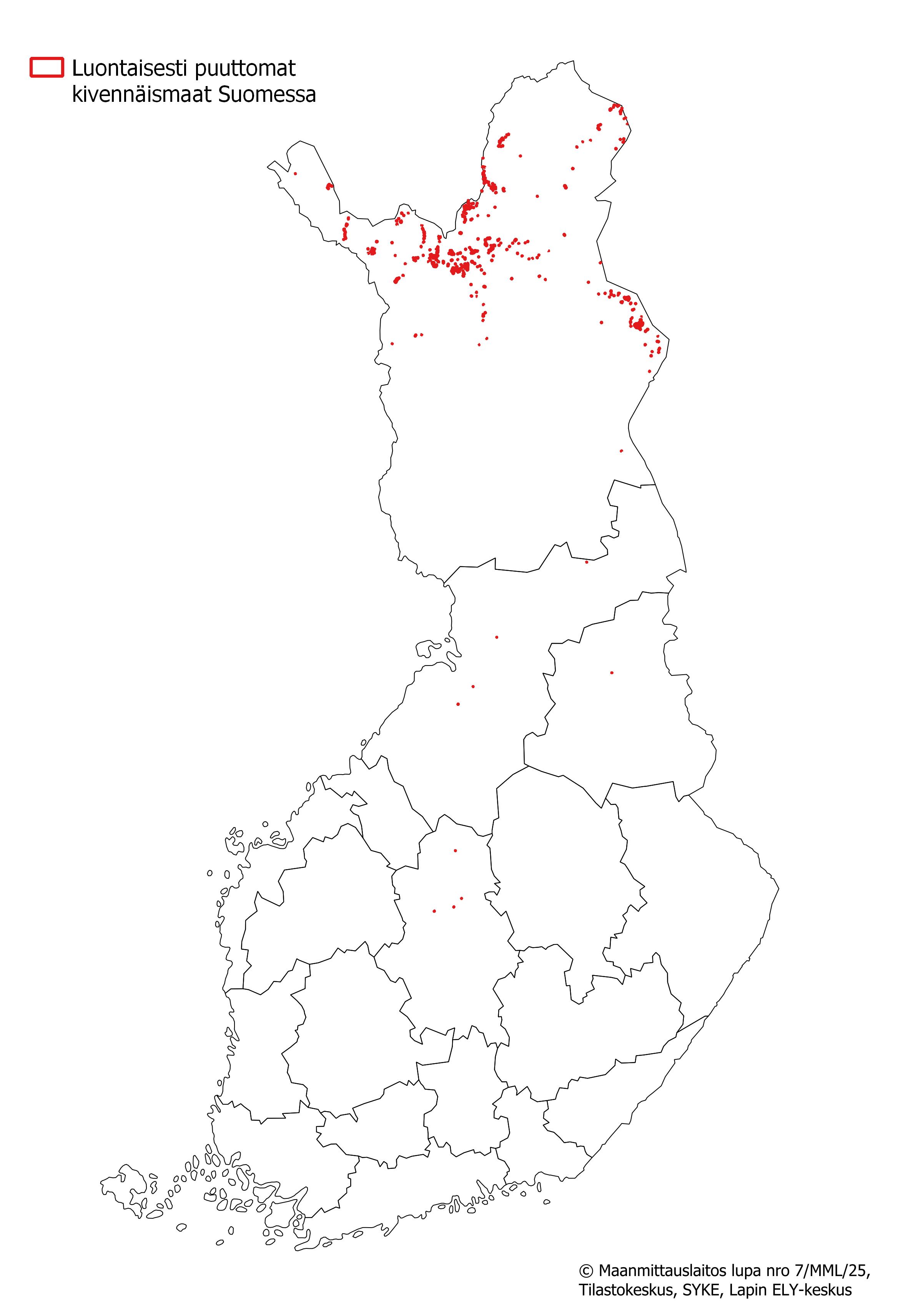 Selvityksen yhteydessä vain osa alueista tarkastettiin maastossa. Aineiston avulla saatiin kuitenkin karkea arvio luontaisesti puuttoman kivennäismaan laajuudesta ja yleisyydestä Suomessa. Tuloksista on koostettu vihjeaineisto, joka on saatavissa Lapin ELY-keskuksesta.