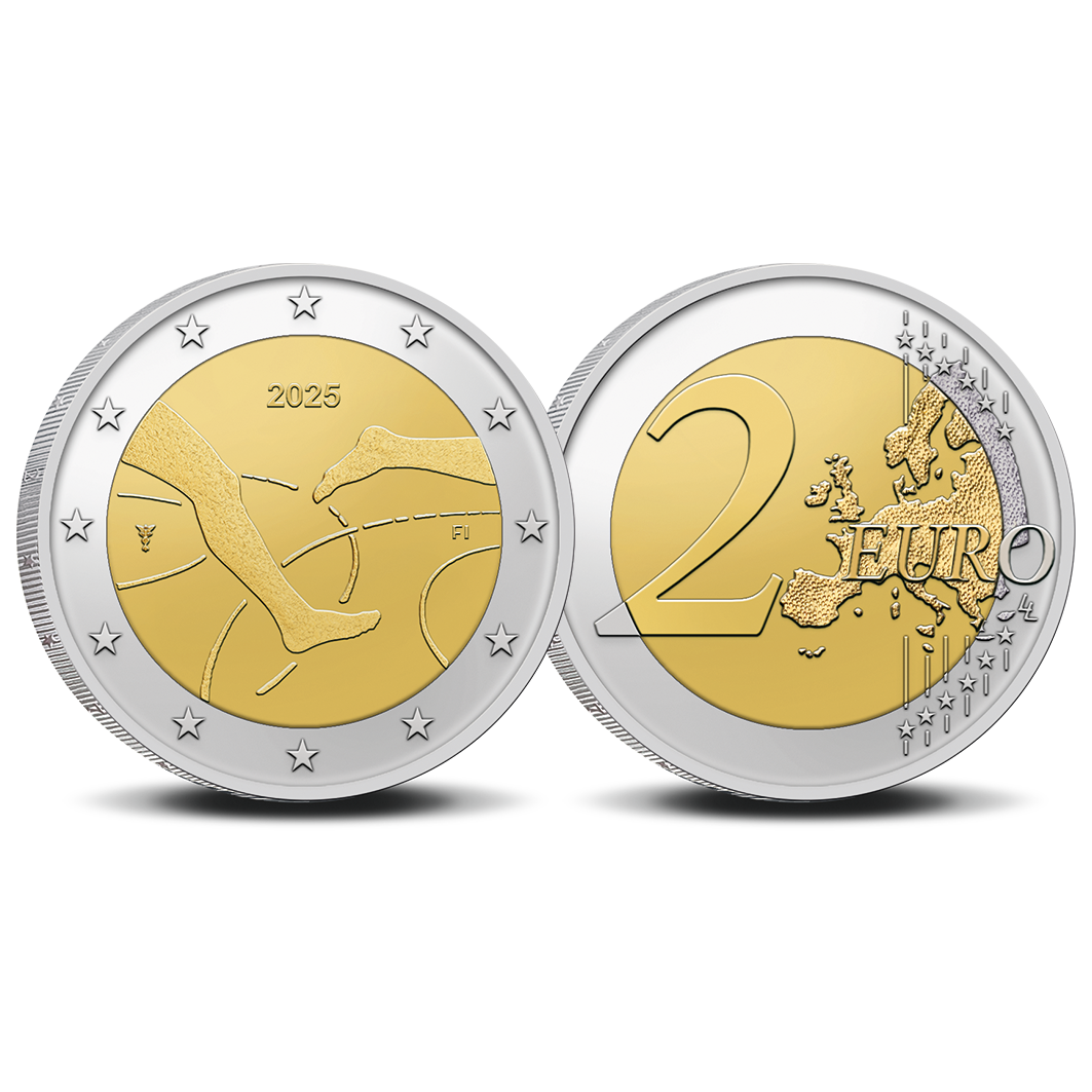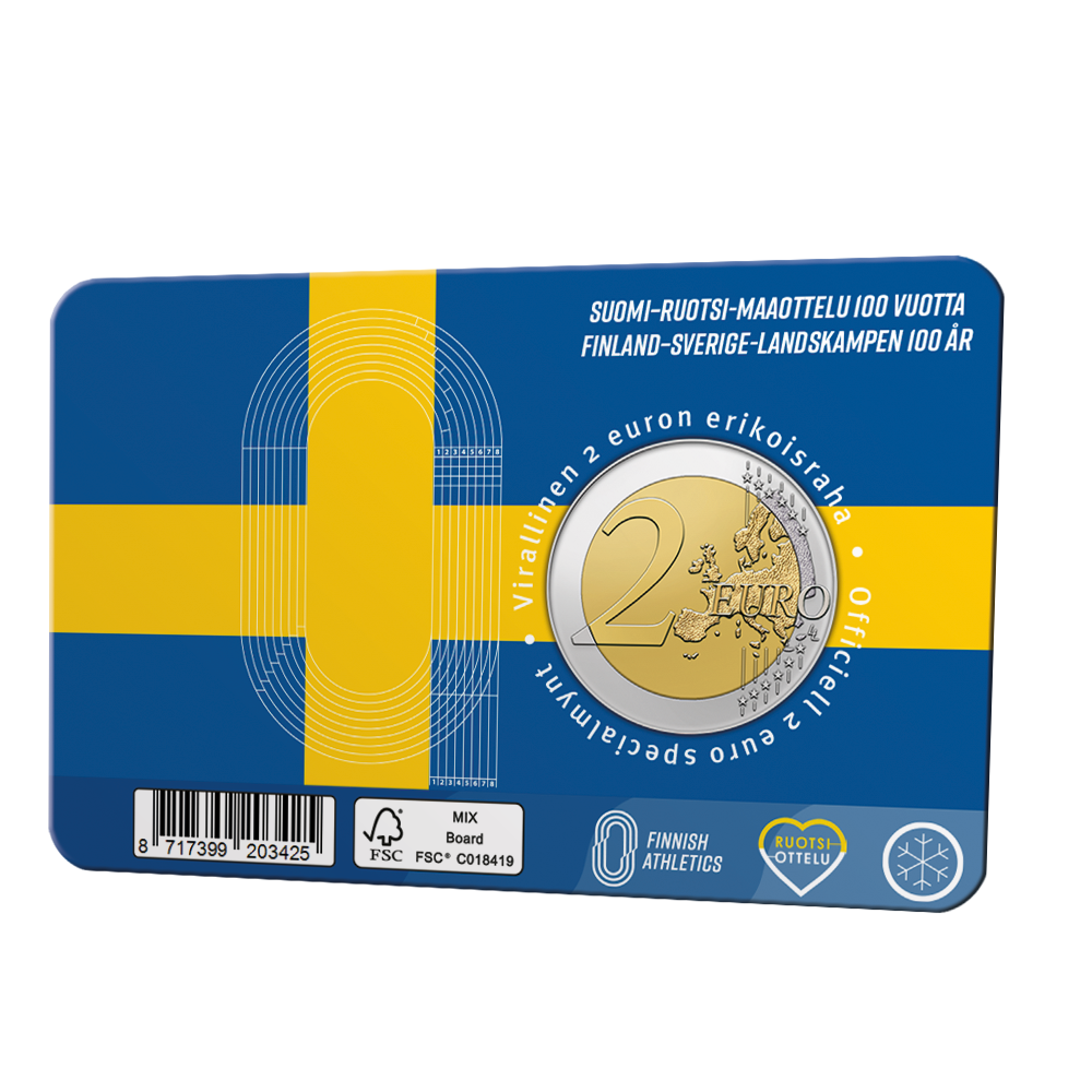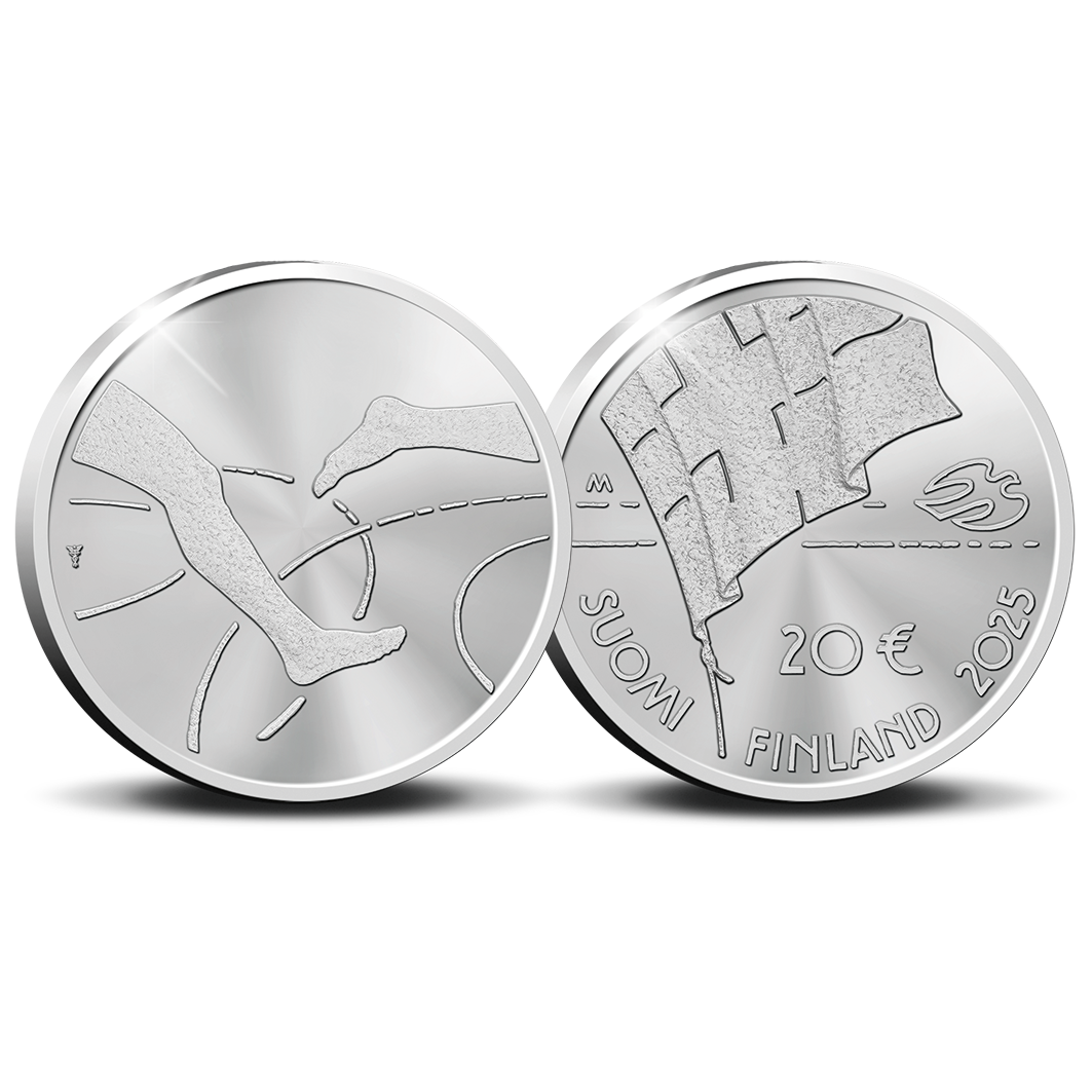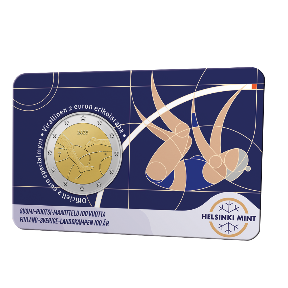 År 2025 utges Finland 20 euro “Finland–Sverige-landskampen 100 år”, formgivet av den välkände konstnären Pertti Mäkinen och präglat av Helsinki Mint på uppdrag av finansministeriet. Åtsidan visar ben i rörelse som symboliserar tävlan och rörelse, tillsammans med korsande linjer som representerar de två nationerna. Frånsidan pryds av en fladdrande finsk flagga med texten Suomi Finland 2025 samt en fågel, som symboliserar frihet och kontinuitet.