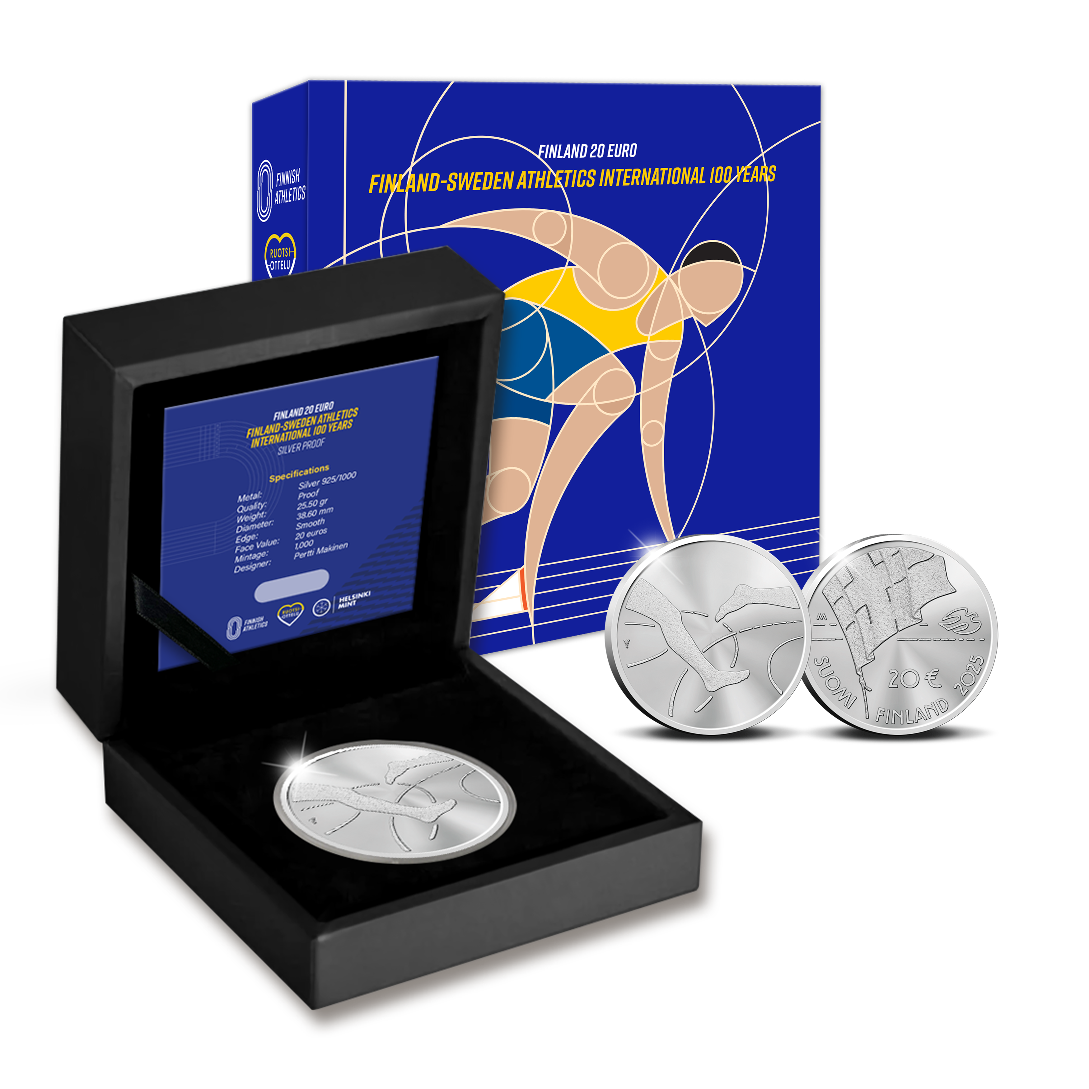 Vuoden 2025 Suomen 20 euroa “100 vuotta Suomi–Ruotsi-maaottelua” -juhlarahan on suunnitellut arvostettu taiteilija Pertti Mäkinen, ja sen on valmistanut Helsinki Mint valtiovarainministeriön toimeksiannosta. Tunnuspuolella näkyvät liikettä symboloivat jalat sekä kahden kansan välistä vuorovaikutusta ilmentävät linjat. Arvopuolella on liehuva Suomen lippu teksteineen Suomi Finland 2025 sekä lintusymboli, joka edustaa vapautta ja jatkuvuutta.