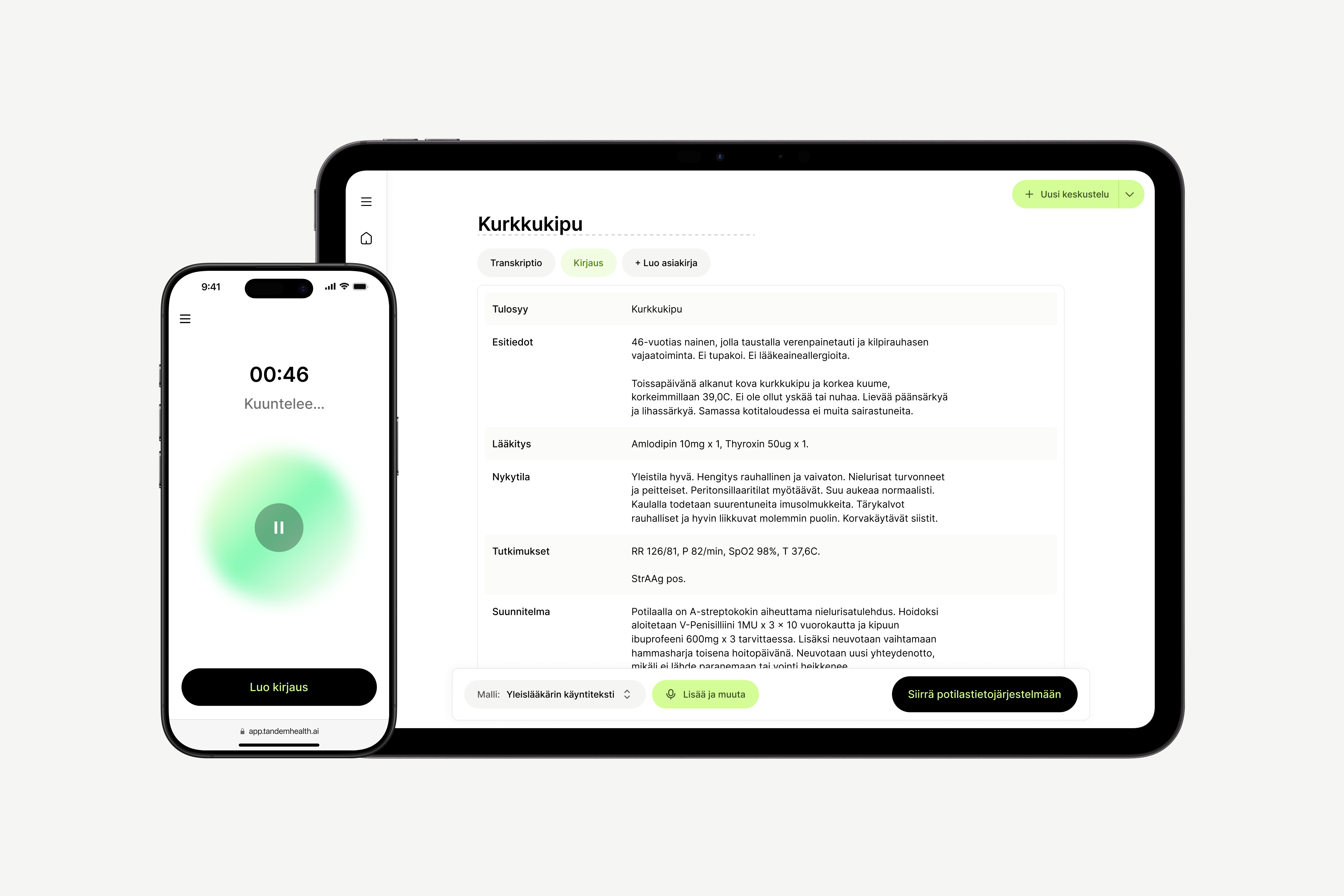 Tandemia käyttää jo yli 1 000 organisaatiota eri puolilla Eurooppaa, ja sen avulla syntyy viikoittain yli 100 000 tekoälyllä tuotettua potilaskirjausta. Sosiaali- ja terveysministeriön selvityksen mukaan ammattilaisilta kuluu yli kolme tuntia päivässä kirjaamiseen – juuri tähän ongelmaan Tandem tarjoaa ratkaisun.