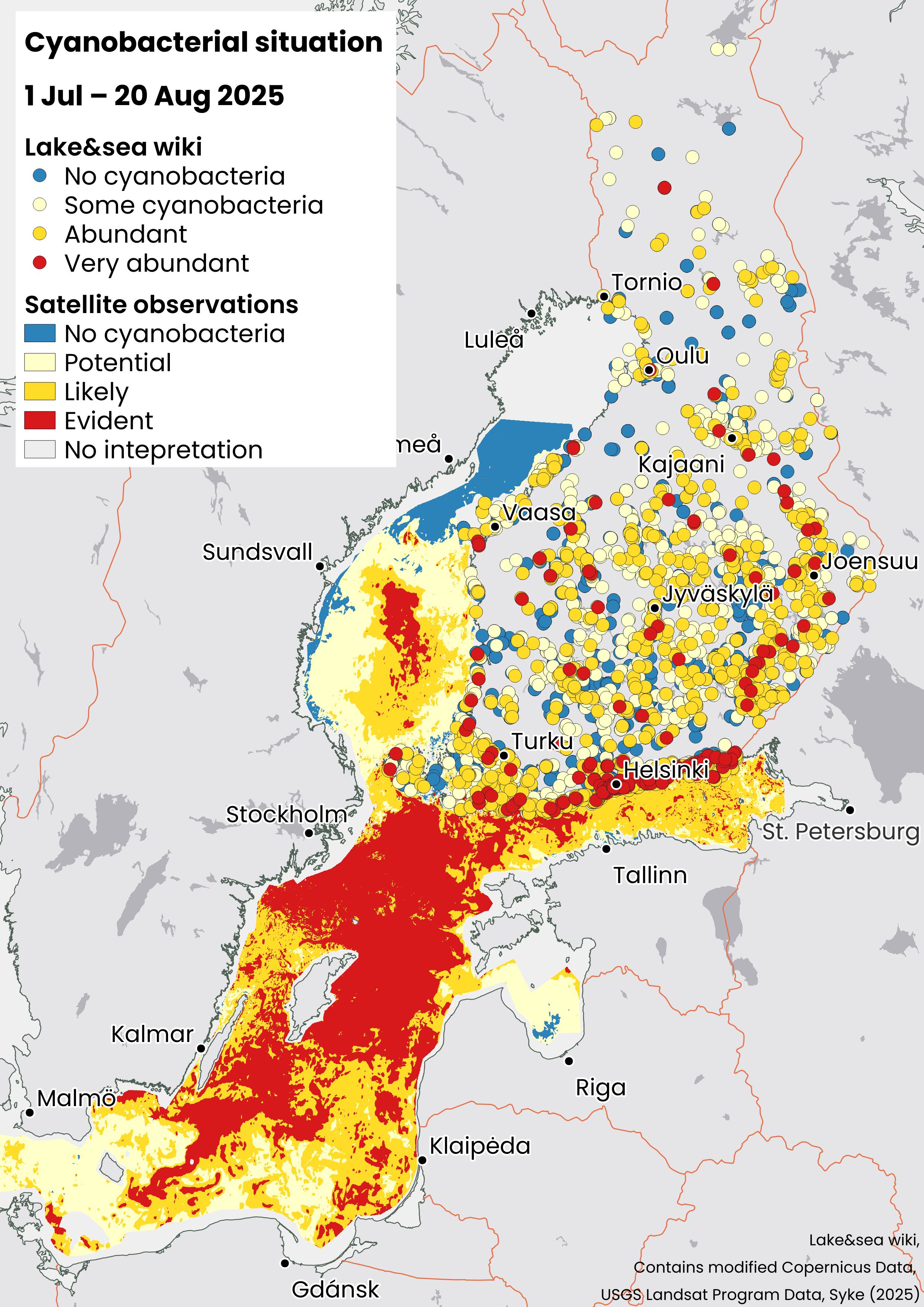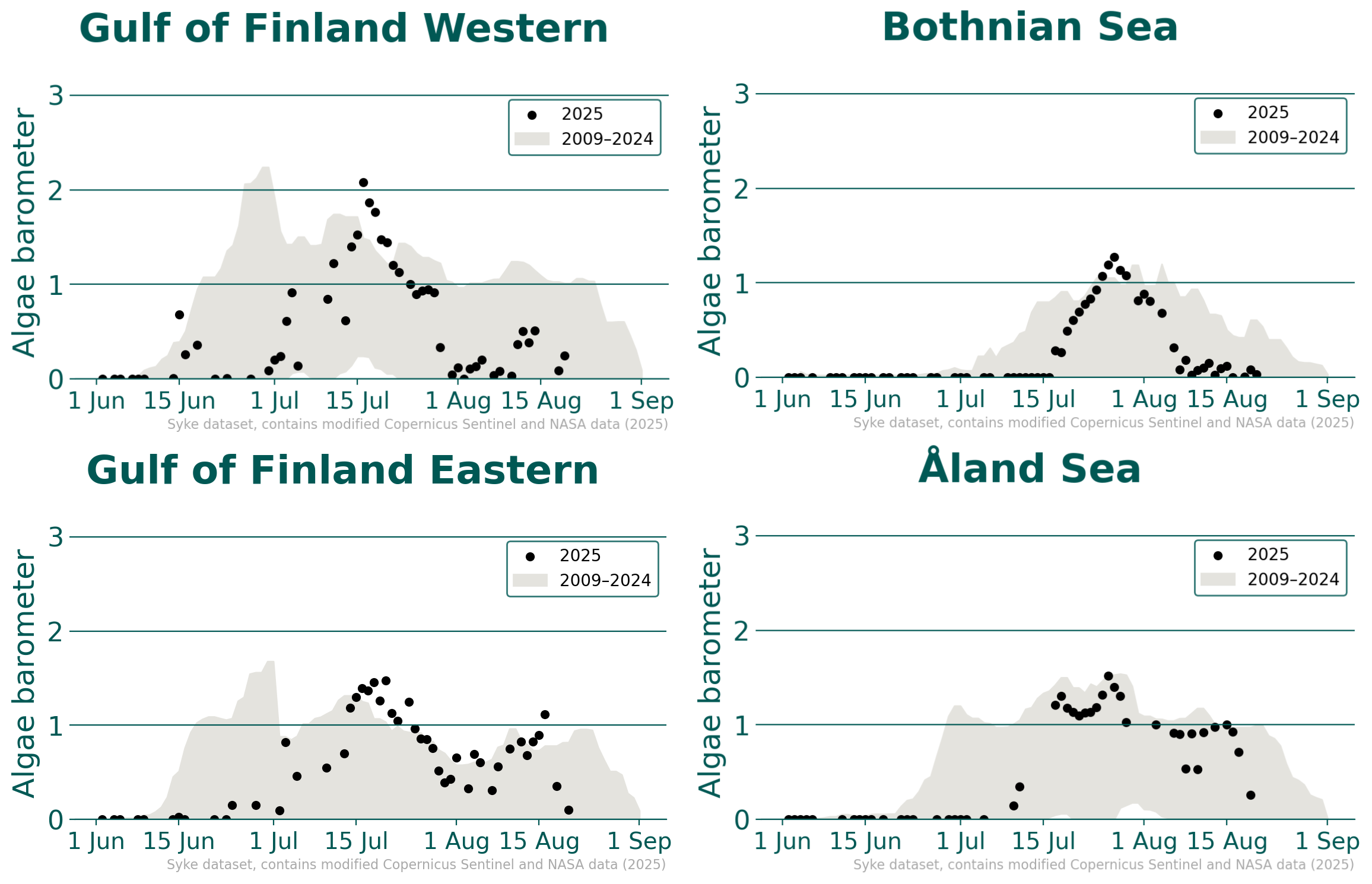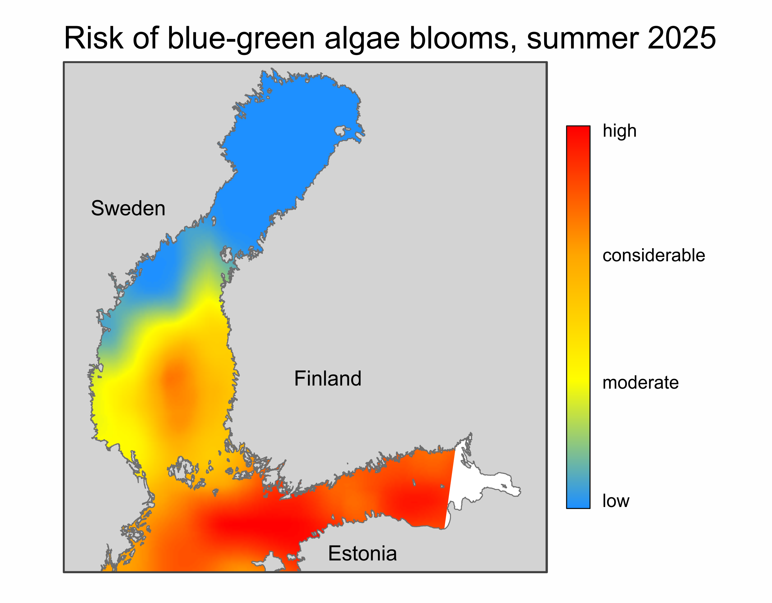 An assessment of the blue-green algae risk in open sea areas for summer 2025 was prepared in early June. It combined forecasts produced by a statistical and a machine learning model. As input data for the models were used data from the Finnish Environment Institute, open sea monitoring data of the Swedish Meteorological and Hydrological Institute (SMHI), coastal monitoring data of the Centres for Economic Development, Transport and the Environment (ELY Centres), the results of Alg@line monitoring carried out by commercial vessels, and satellite image and weather data.