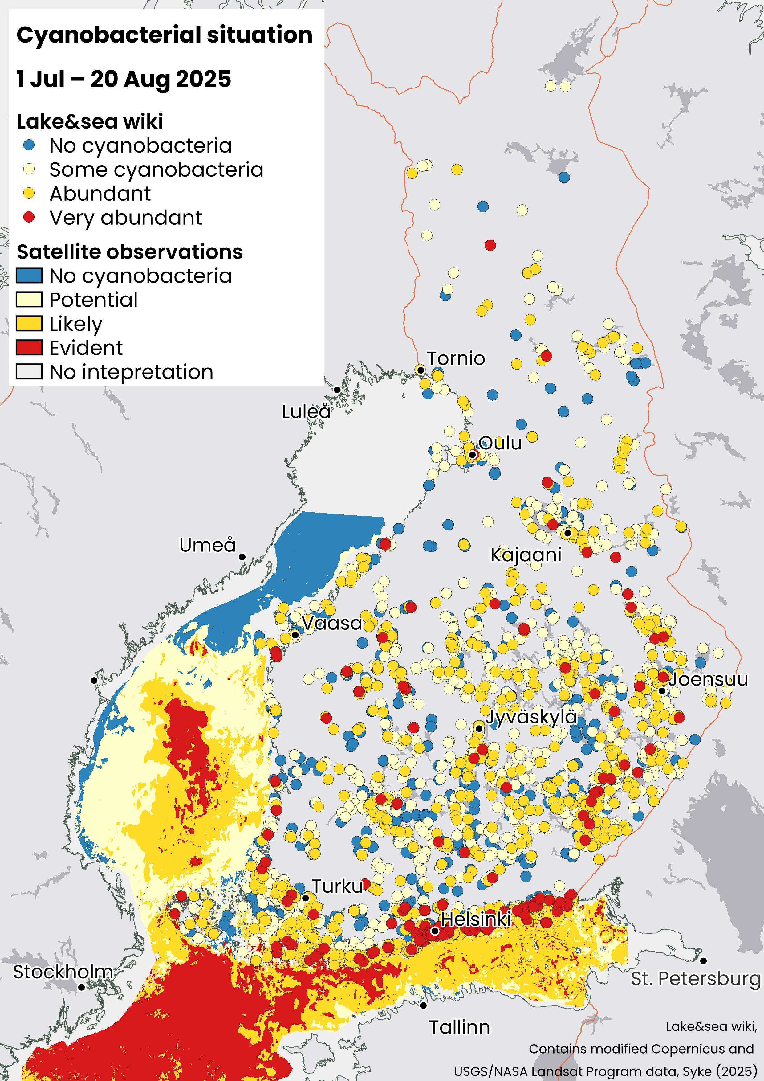 The Finnish Environment Institute Syke monitors the occurrence of blue-green algae as part of the monitoring of the state of the environment and, between June and August, publishes a weekly overview of the blue-green algae situation in inland waters and in sea areas close to Finland. The blue-green algae monitoring continues until the end of September, and the weekly national situation report was published this year between 19 June and 7 August.