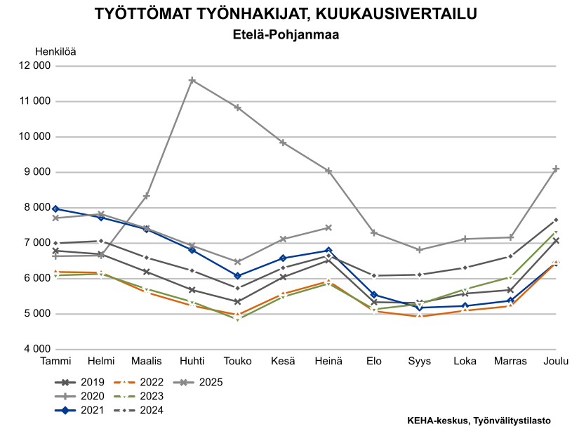 Työttömien työnhakijoiden määrä nousi Etelä-Pohjanmaalla vuoden takaisesta vertailuajankohdasta 792 henkilöllä eli 11,9 prosentilla. Edellisestä kuukaudesta työttömien työnhakijoiden määrä nousi 325 henkilöllä. Koko maassa työttömien työnhakijoiden määrä nousi vuoden takaisesta 10,8 prosentilla.