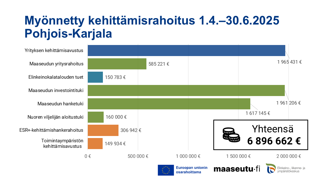 ELY-keskus myönsi vuoden 2025 huhti–kesäkuussa Pohjois-Karjalan yrityksille ja yhteisöille yhteensä liki 6,9 miljoonaa euroa erilaista kehittämisrahoitusta. EU:n rakennerahastojen yrityksen kehittämisavustusta myönnettiin lähes 2 miljoonaa euroa. Maaseuturahastosta myönnettiin maaseudun yritys-, investointi- ja kehittämishankkeisiin rahoitusta yhteensä yli 4,3 miljoonaa euroa.