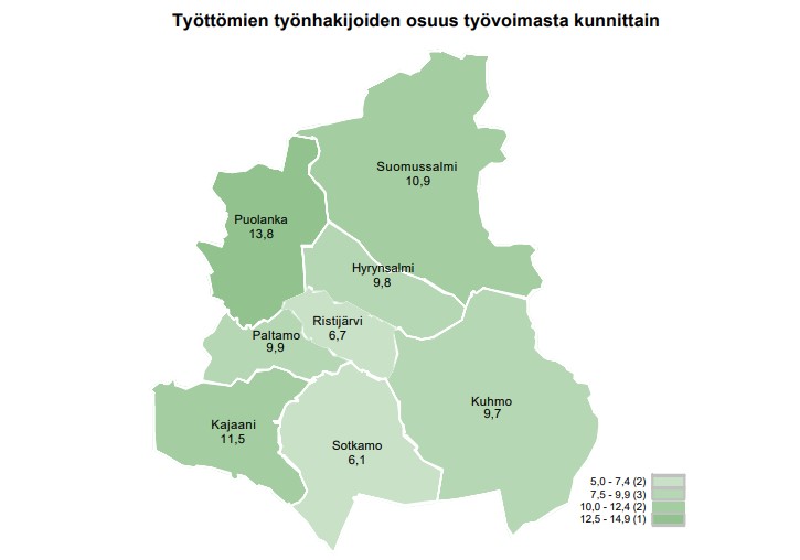 Kainuun kunnissa työttömyys pieneni viime vuodesta viidessä kunnassa ja nousi kolmessa. Lasku oli suhteellisesti suurinta Ristijärvellä (-32 %), Puolangalla (-18 %) ja Hyrynsalmella (-15 %), kasvua tuli eniten Kajaanissa (+8 %) ja Kuhmossa (+6 %). Työttömien työnhakijoiden osuus työvoimasta oli peräti seitsemässä Kainuun kunnassa matalampi kuin koko maan keskiarvo 12,5 %. Alhaisin työttömyysaste oli Sotkamon 6,1 % ja Ristijärven 6,7 %. Korkein työttömyysaste oli Puolangan 13,8 % ja Kajaanin 11,5 %.