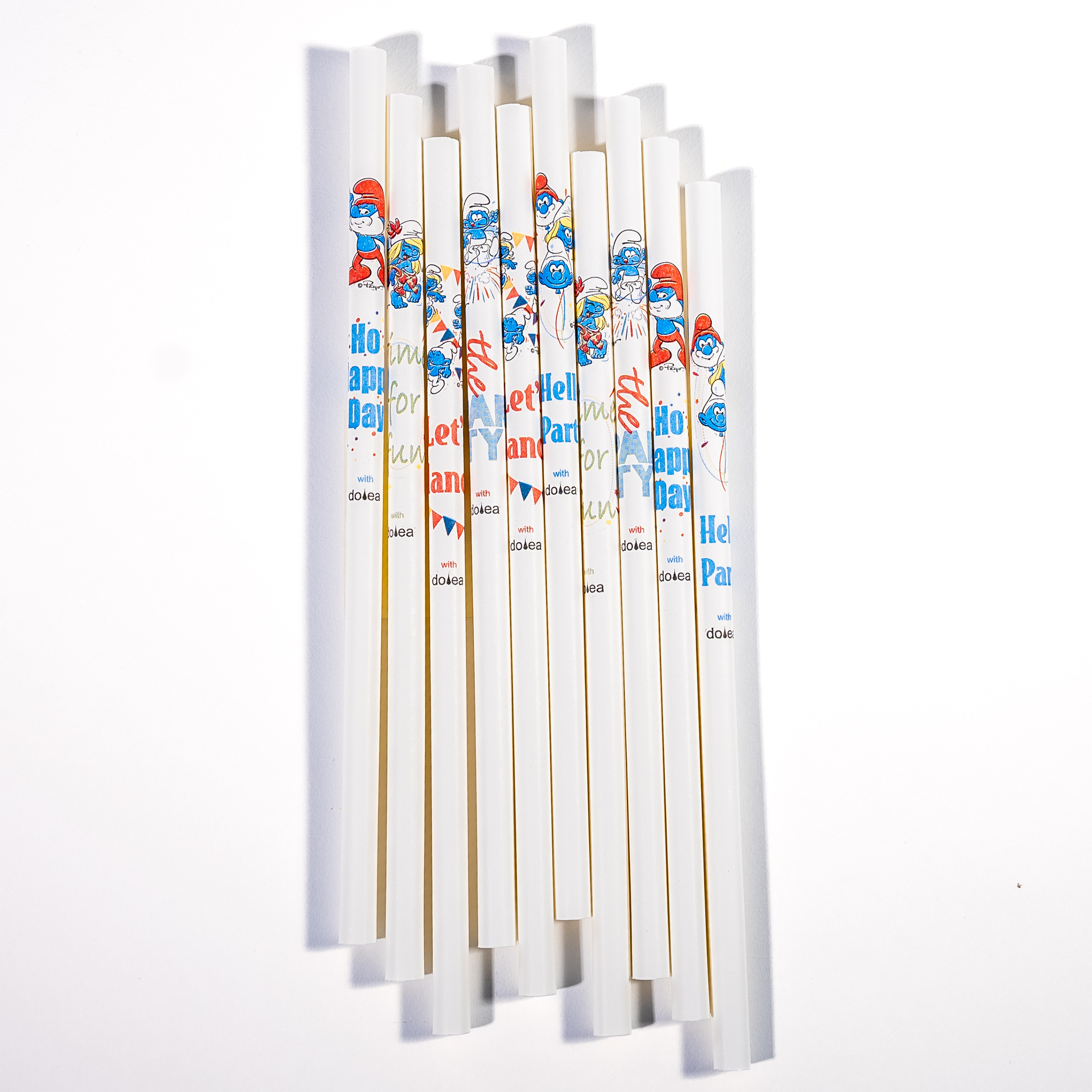 In celebration of the new Smurfs movie, "Smurfs", premiered in July globally, Dolea is launching a new collaboration with The Smurfs: Smurfs straws made from 100% recyclable paperboard.