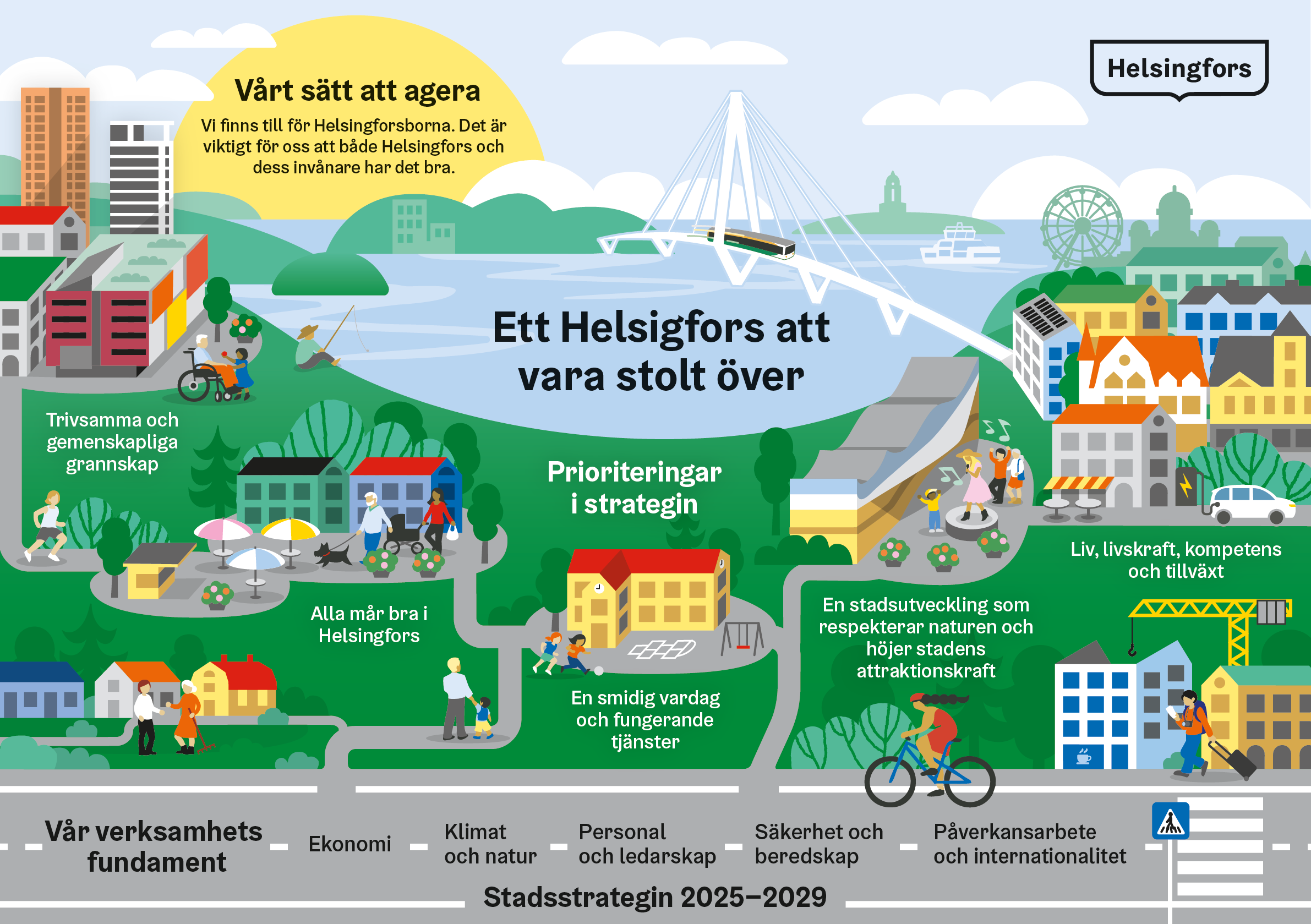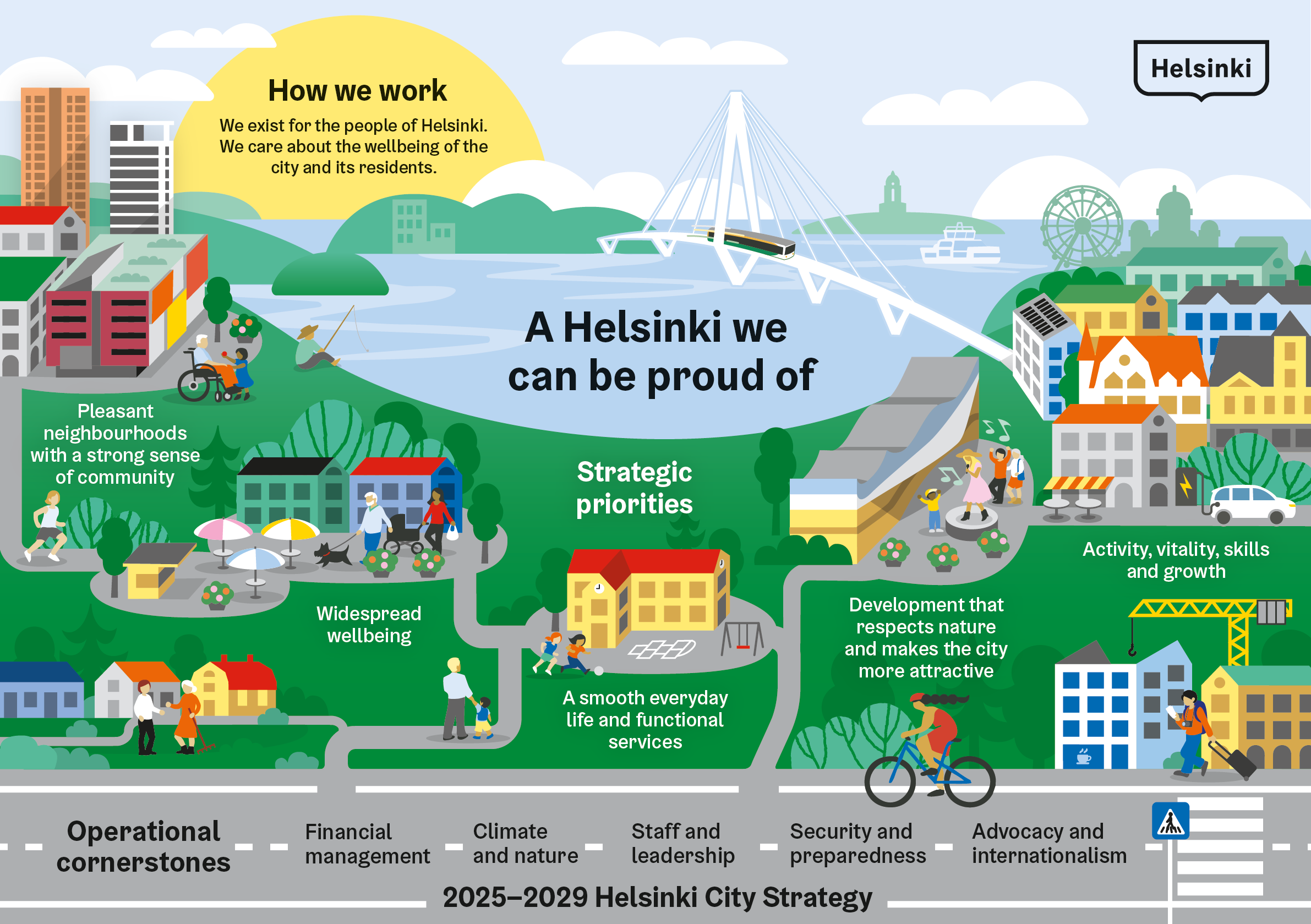 Helsingin kaupunginvaltuusto hyväksyi uuden kaupunkistrategian 27. elokuuta. Helsinki josta voimme olla ylpeitä ohjaa kaupungin talouden ja toiminnan suunnittelua vuosina 2025–2029. Strategia muodostuu viidestä painopisteestä, viidestä kivijalasta ja tavastamme toimia.