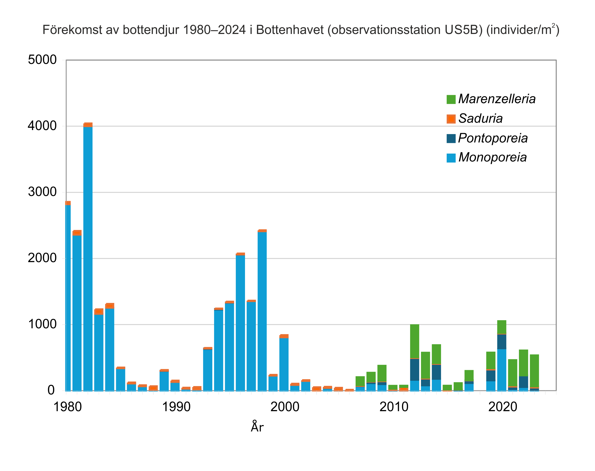Bottendjursamhället i Bottenhavet har förändrats på 2000-talet. De naturliga cyklerna i förekomsten av vitmärlor har försvagats. Orsaken till detta är sannolikt förändringar i vattenpelarens produktion, som har försämrat kvaliteten på den för märlor lämpliga föda som sjunker till botten. Den främmande arten amerikansk havsborstmask (Marenzelleria spp.), som etablerade sig i Bottenhavet på 2000-talet, har ökat mångfalden i bottendjursamhället. När havsborstmaskarna gräver i och bearbetar bottensedimentet har de både positiva och negativa effekter på livsmiljön på bottnen.