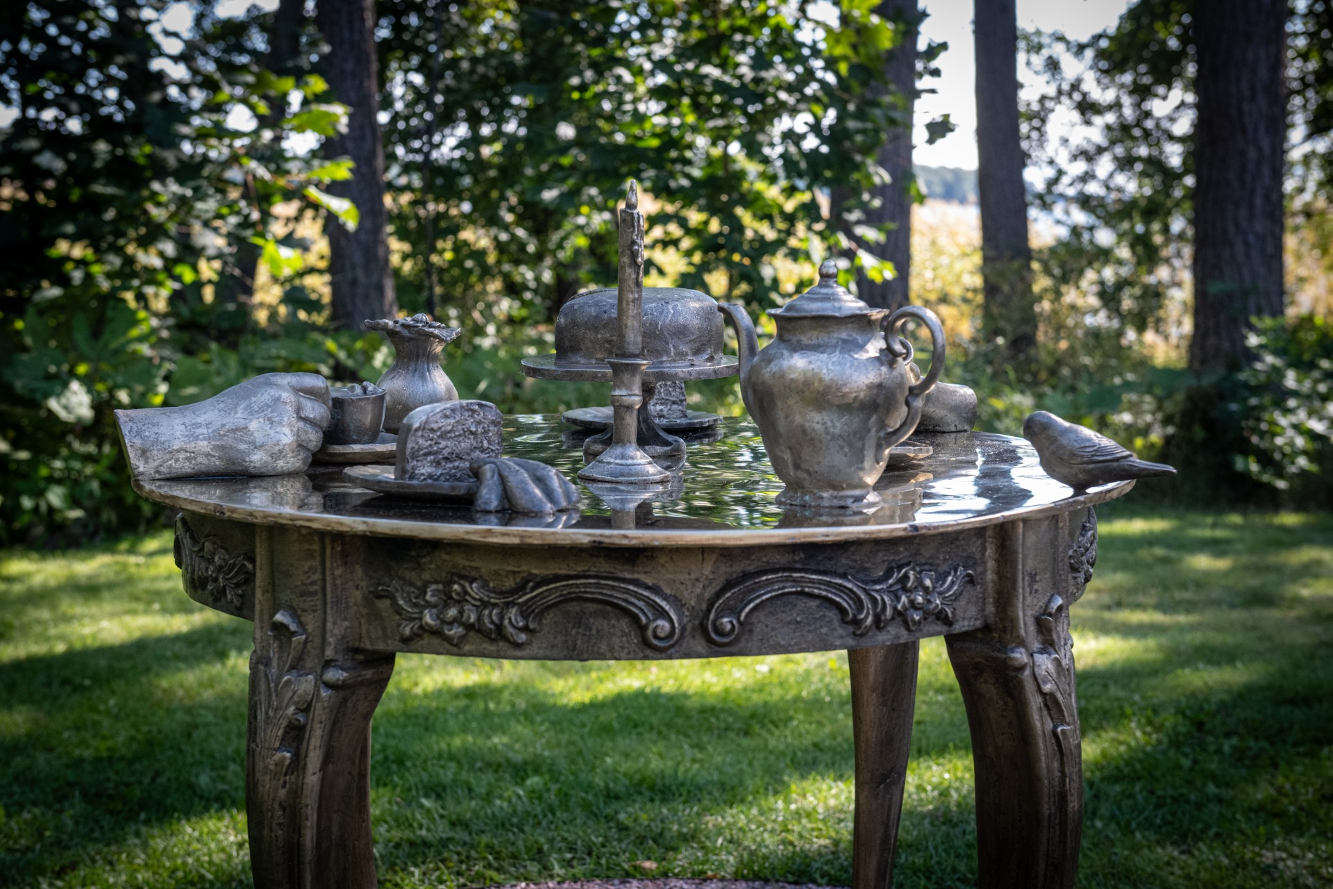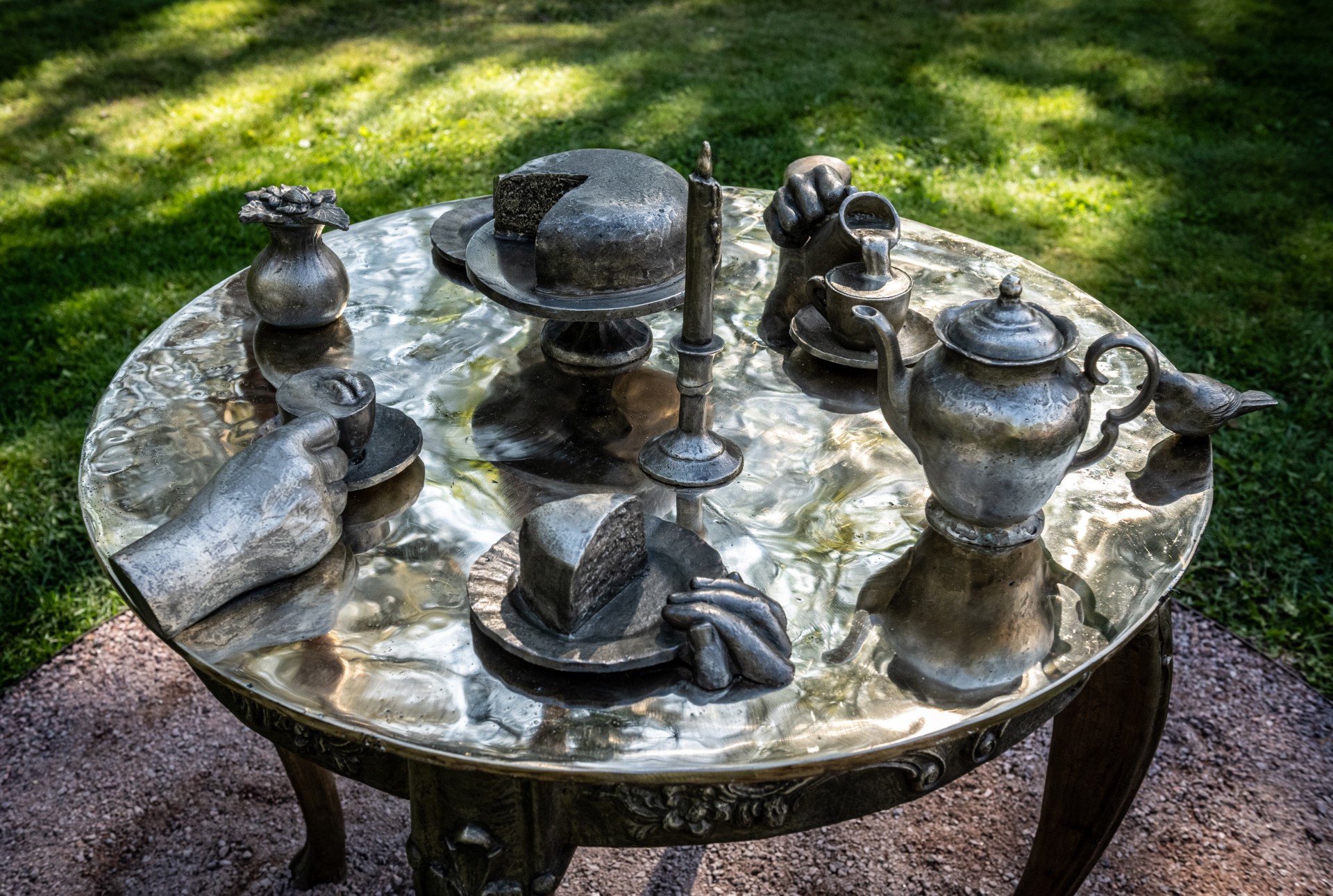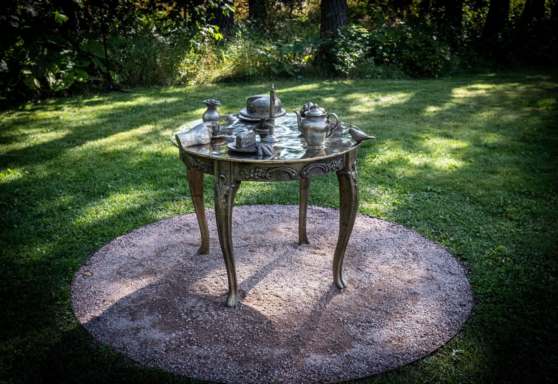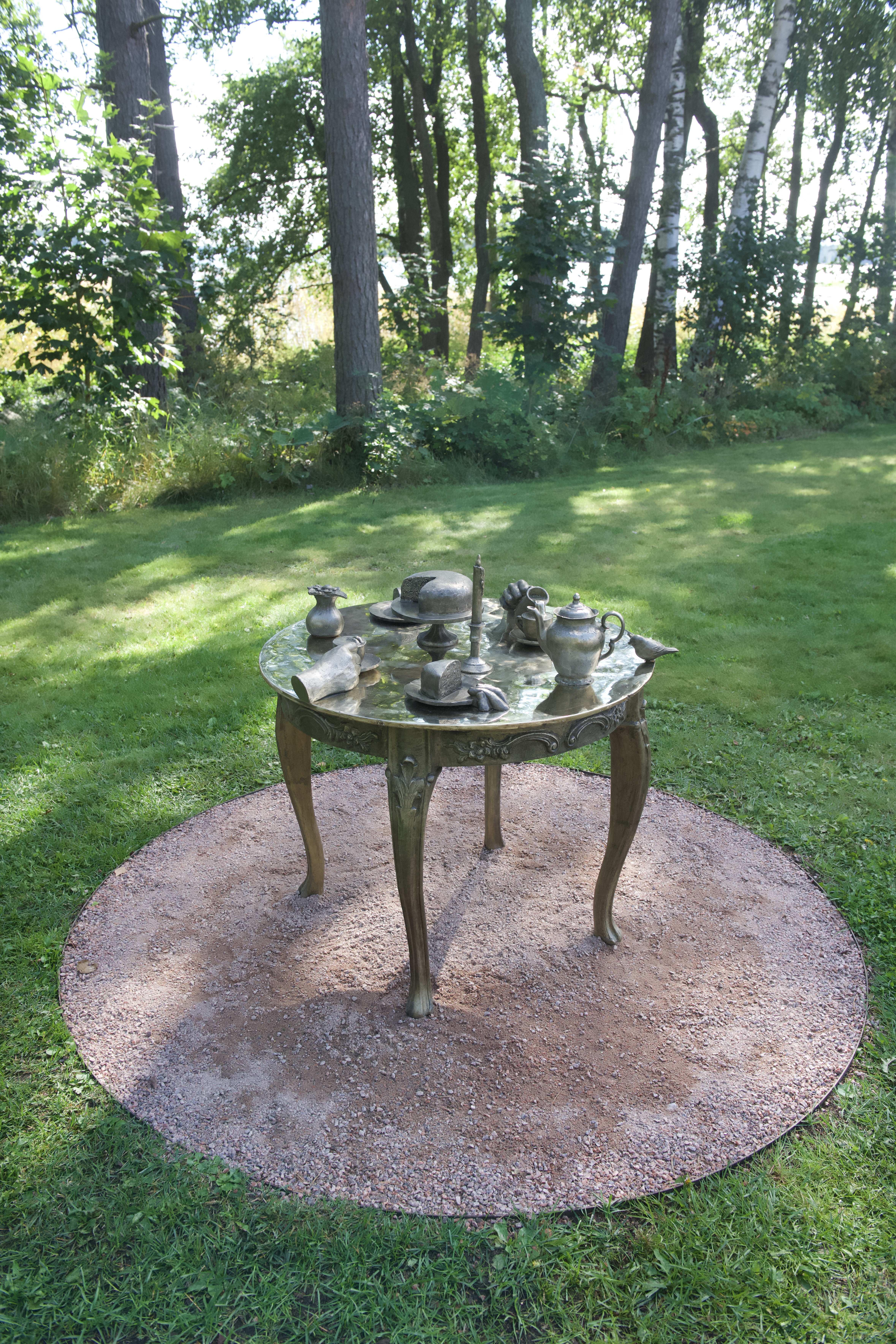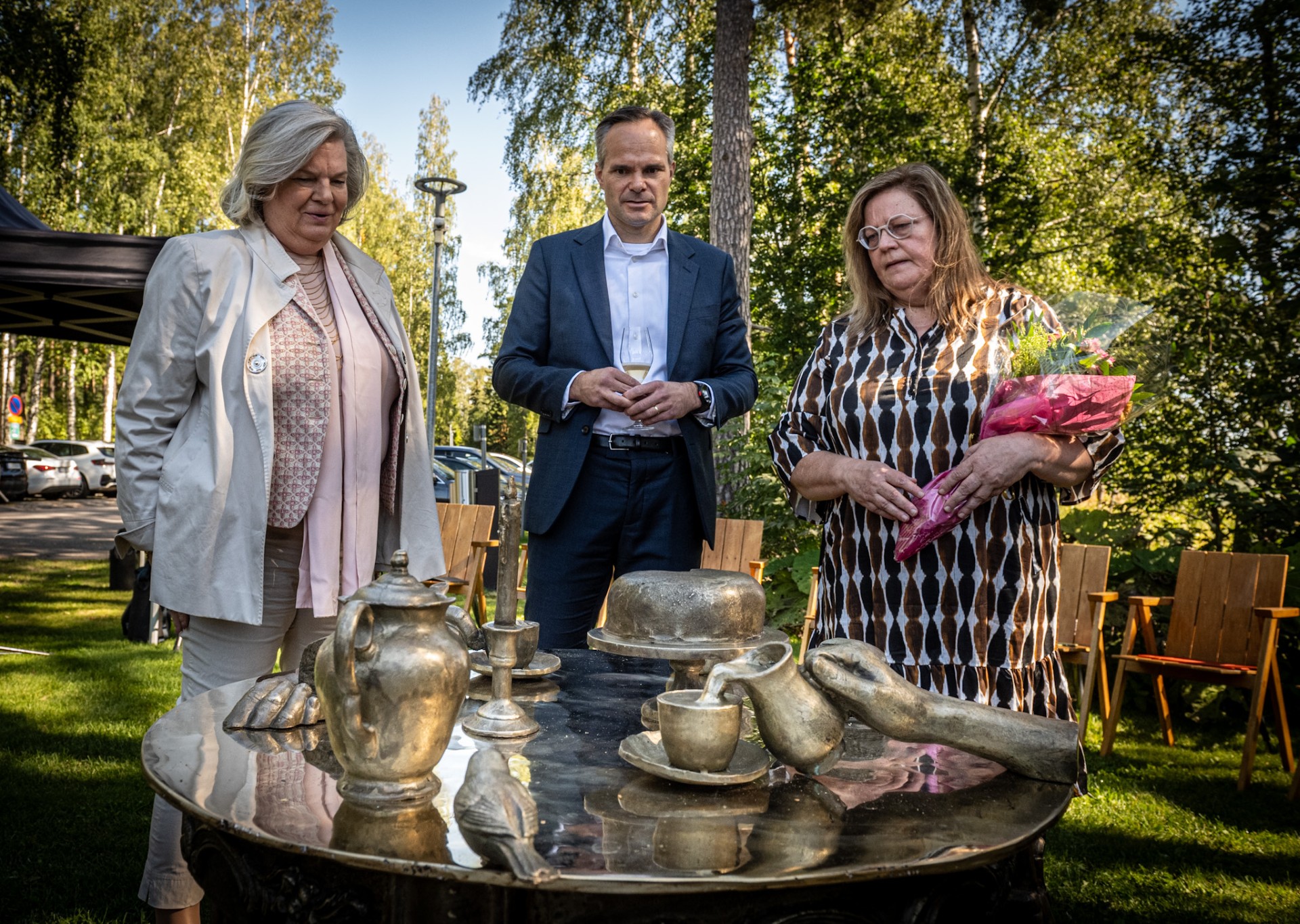 Anne Meskanen-Barmanin taideteos Kahvitauko (Fikapaus) paljastettiin tänään Hanaholmenin taidepuistossa Espoossa. Pronssiveistos, joka on Espoon kaupungin lahja Hanaholmenin 50-vuotisjuhlan kunniaksi, esittää katettua kahvipöytää herkkuineen.