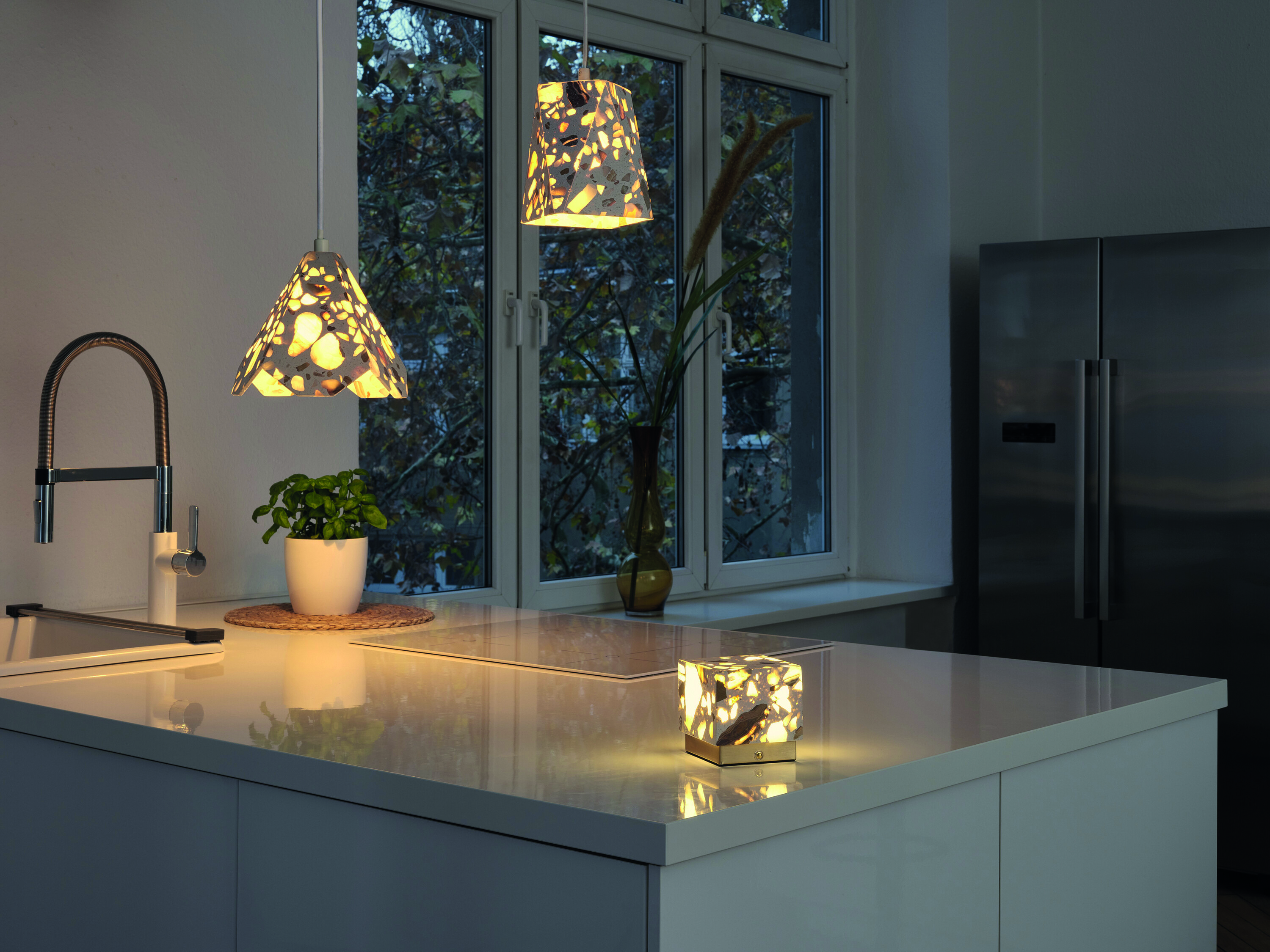Yksi syksyn mielenkiintoisimmista uutuustuotteista on terrazzosta valmistetut valaisimet. Decor Gleam -valaisimien pinta on vaaleankirjava ja kivimäinen. Osittain läpikuultava lampun varjostin loistaa kauniisti valoa ympärilleen toimien erinomaisesti huoneen katseenvangitsijana. Valaisinsarjaan kuuluu kolme erilaista riippuvalaisinta sekä USB-C ladattava pöytävalaisin. Vaaleat ja elegantit valaisimet sopivat monenlaiseen sisustukseen.