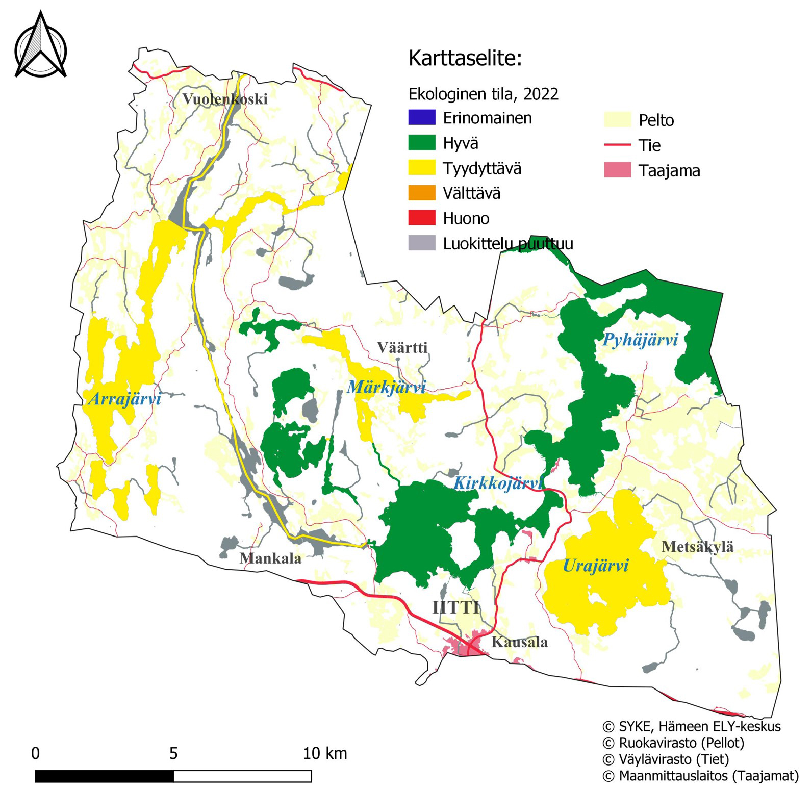 Hankealueeseen kuuluvat Iitin pohjoispuolen vesistöt pohja- ja virtavesiä unohtamatta. Hankealue kuuluu Kymijoen vesistöalueeseen. Sen suurimmista järvistä Arrajärvi, Märkjärvi ja Urajärvi ovat nykyisin ekologisessa tilaluokassa tyydyttävä. Kotojärvi, Vähä- ja Iso-Valkjärvi sekä Kirkkojärvi ja Pyhäjärvi kuuluvat hyvään ekologiseen tilaluokkaan.