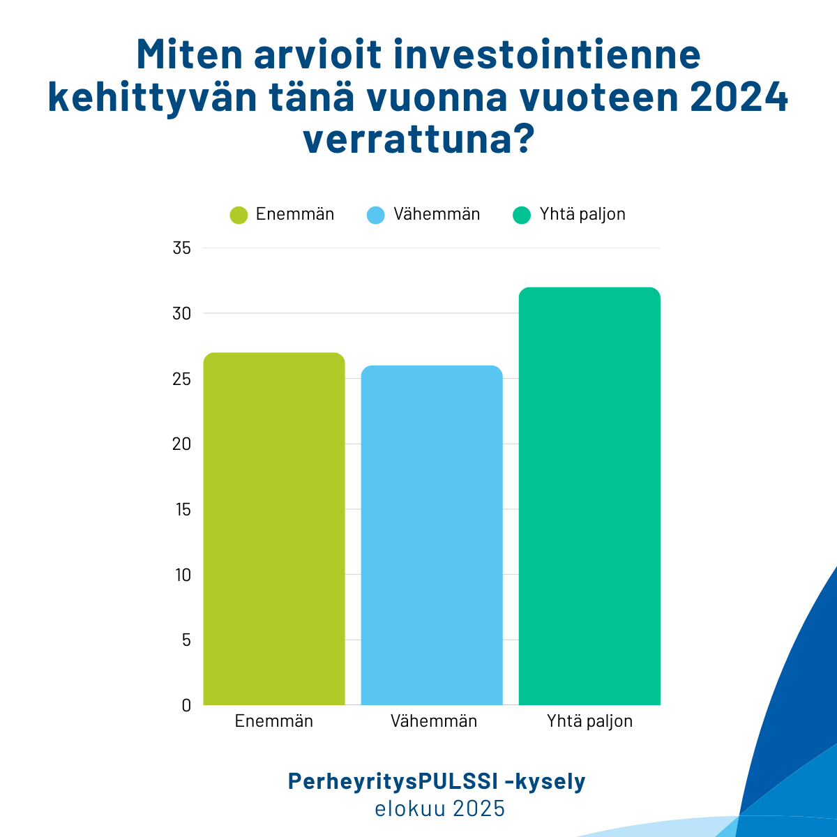 Perheyritykset suhtautuvat vuoteen 2026 varovaisen toiveikkaasti. PerheyritysPULSSI -kyselyn mukaan perheyritysten investointiaikeet pysyttelevät myönteisinä: 24 prosenttia vastaajayrityksistä aikoo investoida vuonna 2026 enemmän kuin tänä vuonna. Talouden epävarmuus ja hallinnollisen taakan lisääntyminen jarruttelevat perheyritysten kasvua.