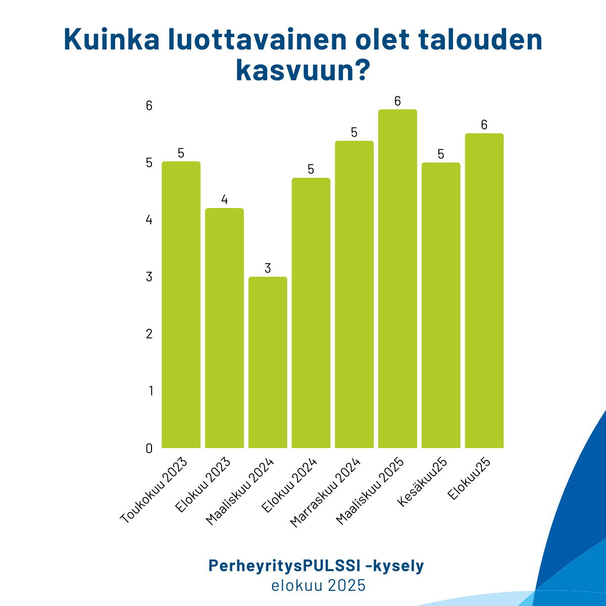 PerheyritysPULSSI on Perheyritysten liiton neljä kertaa vuodessa jäsenilleen tekemä kysely. Suurin osa vastaajista on omistajia yrityksissä, joiden liikevaihto on 10–50 miljoonaa euroa ja jotka työllistävät 10–250 henkeä. Vastaajat ovat tyypillisesti omistajayrittäjiä teollisuuden, palveluiden ja kaupan aloilta. Kyselyyn vastasi 96 perheyritysten edustajaa 18. -24.8.2025 välisenä aikana.