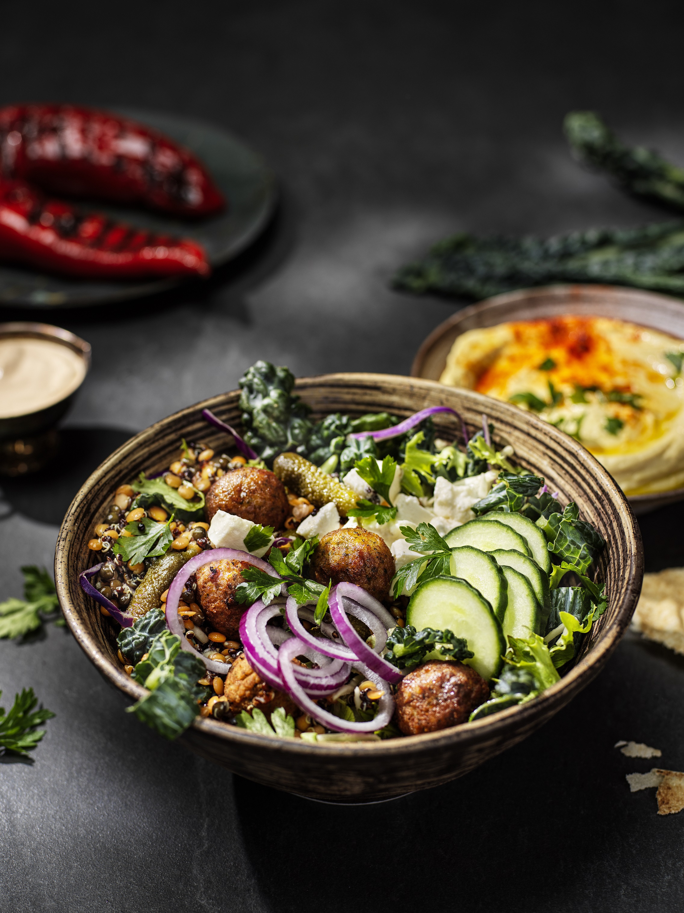 Keitä viljat ja linssit, valuta ja mausta oliiviöljyllä, suolalla ja sitruunan tai limen mehulla. Aseta kaalisuikaleet kulhon pohjalle. Lisää lämpimät viljat, grillattu paprika, punasipuli ja kuumat falafelit. Viimeistele pehmeällä juustolla ja cocktailkurkuilla. Lorauta lopuksi päälle kastiketta.