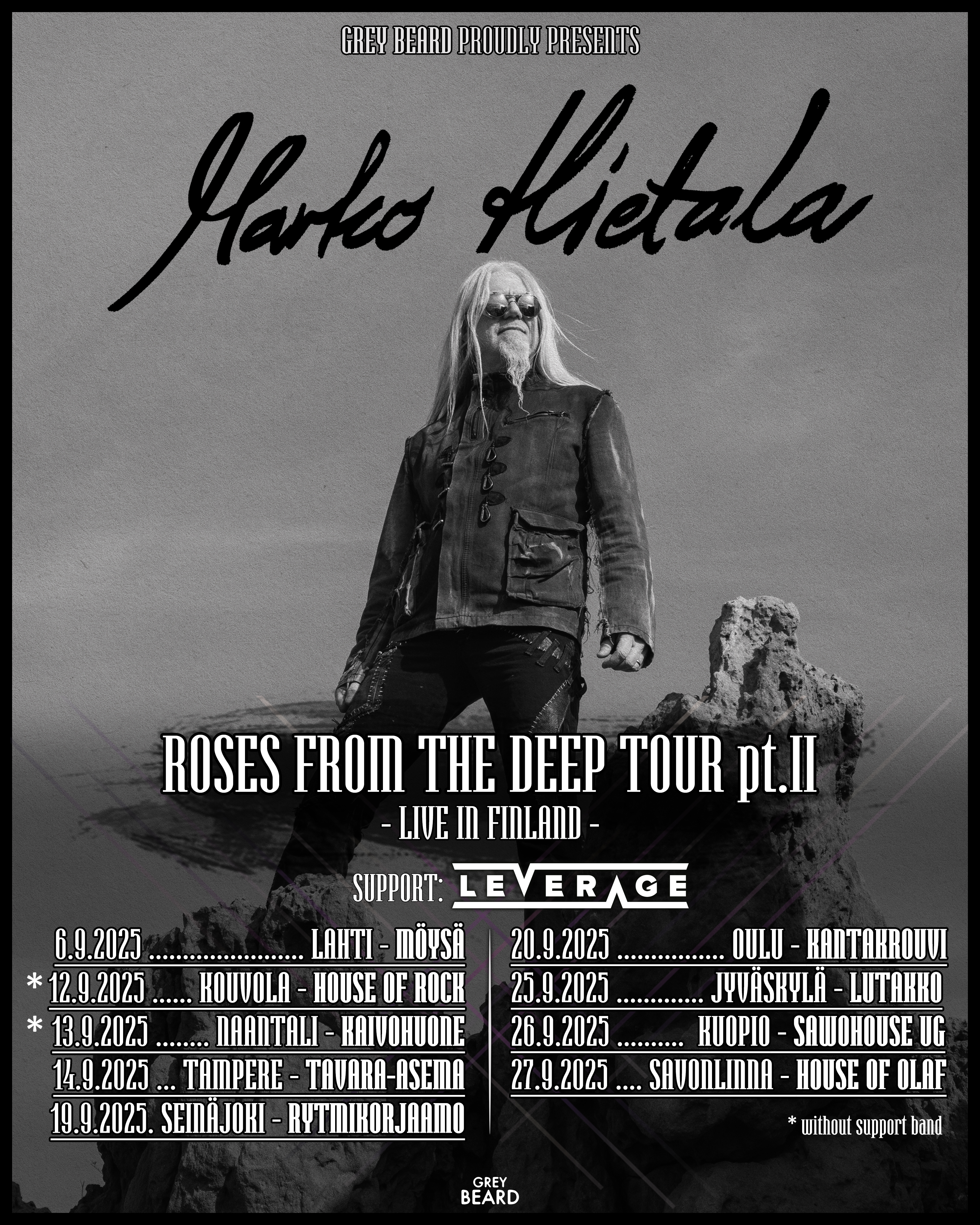 Metallilegenda Marko Hietala palaa keikkalavoille eri puolilla Suomea ”Roses From The Deep – Tour Pt. 2” -kiertueensa myötä. Kriitikoiden ylistämä ”Roses From The Deep” -albumi on saanut kiitosta tunteikkaasta ilmaisustaan ja vahvasta musiikillisesta otteestaan, ja se jatkaa fanien hurmaamista ympäri maailman. Tulevalla kiertueella tullaan kuulemaan sekä uutta materiaalia että fanien kestosuosikkeja.