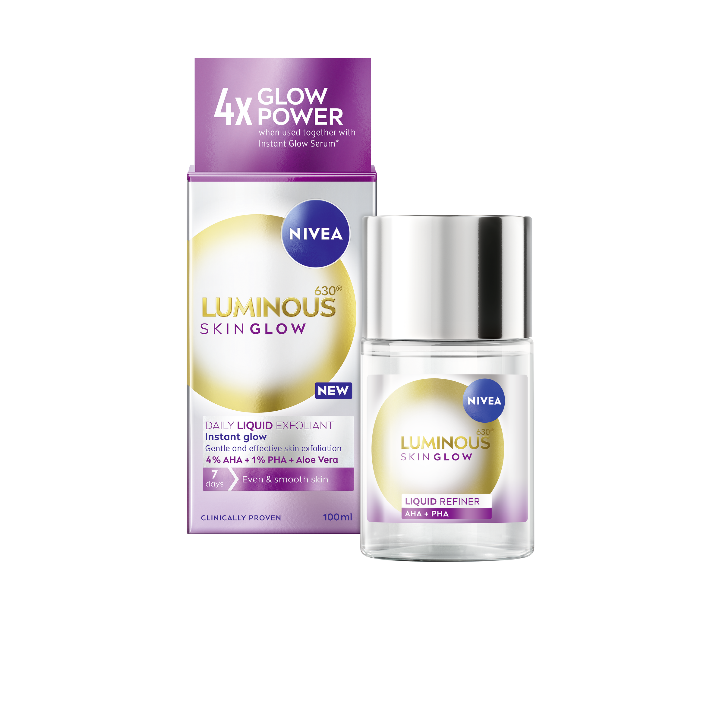 NIVEA LUMINOUS630® SKIN GLOW Daily Liquid Exfoliant – iholle jätettävä kuoriva hoitoneste tehostaa Skin Glow -hoitokokonaisuutta. Hoitoneste tasoittaa ihon sävyä viikossa, häivyttää ihohuokosia ja uudistaa ihoa.