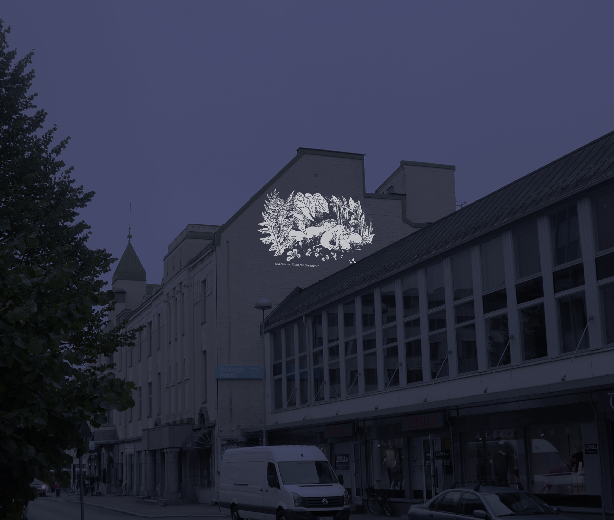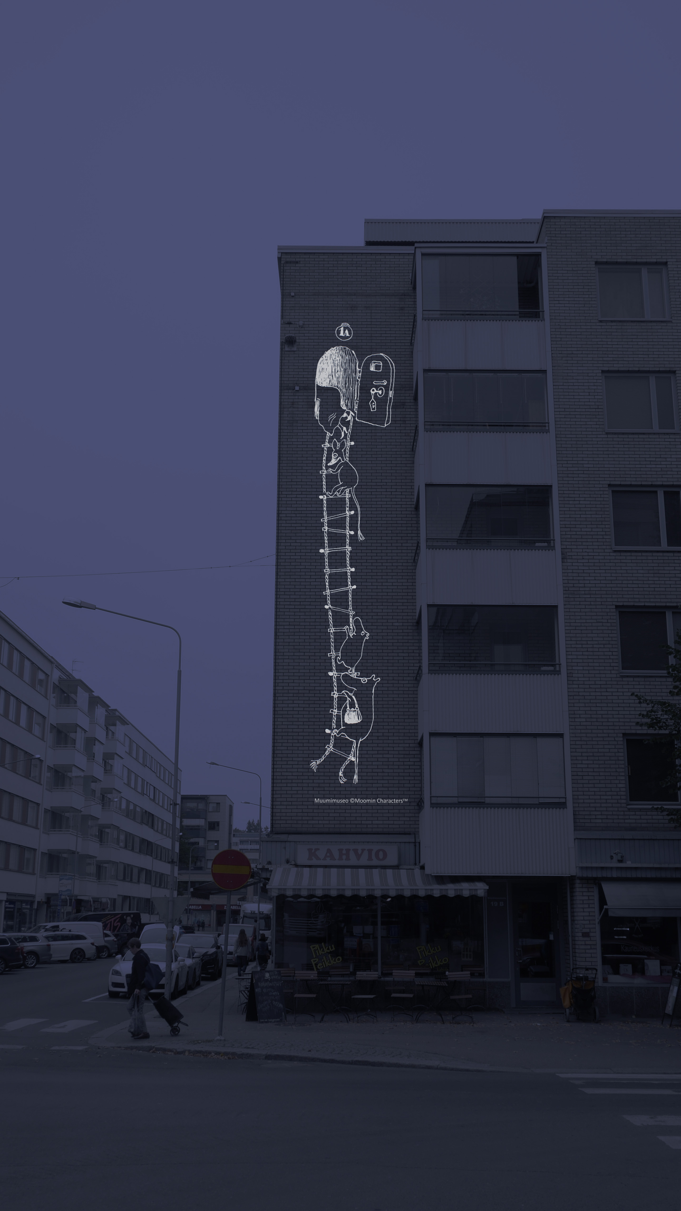 Tove Janssonin ensimmäinen muumitarina Muumit ja suuri tuhotulva täyttää tänä vuonna 80 vuotta. Tampereen läntisen keskustan seinille heijastetaan 15 valoteosta, jotka perustuvat Janssonin alkuperäisiin kirjankuvituksiin vuodelta 1945. Muumit ja suuri tuhotulva kertoo Muumimamman ja Muumipeikon matkasta, kun he etsivät Muumipappaa. Matkalle liittyvät Nipsu ja Tulppaana, ja seurue kohtaa monenlaisia hahmoja – käärmeitä, merikissoja, marabuhaikaroita ja muita satumaisia olentoja. Tarina kuljettaa lukijan rehevästä viidakosta makeaan satumaisemaan, myrskyävälle merelle ja tulvan keskelle. Lopulta seurue löytää tiensä Muumilaaksoon – paikkaan, jossa kohoaa pyöreä, kaakeliuunia muistuttava sininen talo. Muumitalo on turvan ja yhteenkuuluvuuden symboli, joka on keskeinen osa Janssonin ensimmäistä muumitarinaa.