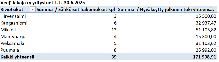Etelä-Savon Leader-ryhmistä Veej’jakaja ry on myöntänyt rahoitusta 69 maaseudun yritysten ja yhteisöjen kehittämis- ja investointitoimenpiteeseen yhteensä noin 730 000 euroa. Näistä 39 on ollut yritystukia ja myönnetyn rahoituksen määrä 171 938 euroa. Kehittämishankkeisiin, joita on 30, on myönnetty 557 132 euroa. Setelityyppisten yritystukien kysyntä on jatkanut vilkkaana.