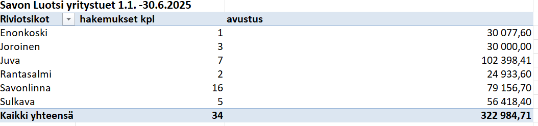 SavonLuotsi Leader ry on myöntänyt rahoitusta 63 maaseutuyrityksen ja yhteisön toimenpiteeseen yhteensä noin miljoona euroa. SavonLuotsi Leaderin toiminta-alueella kehittämishankkeita on saatu hyvin liikkeelle ja 29 kehittämishankkeeseen on myönnetty 678 608 euroa. Yritystukiin, joita on 34, on myönnetty 322 984 euroa.