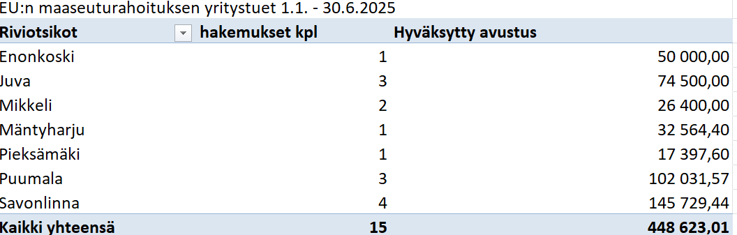 Maaseudun yritysrahoitusta on myönnetty 15 yritykselle yhteensä noin 450 000 euroa vuonna 2025. Tuettuja toimialoja ovat mm. elintarvikejalostus, matkailu, bioenergia, ohjelmistojen suunnittelu ja metallituotteiden valmistus.