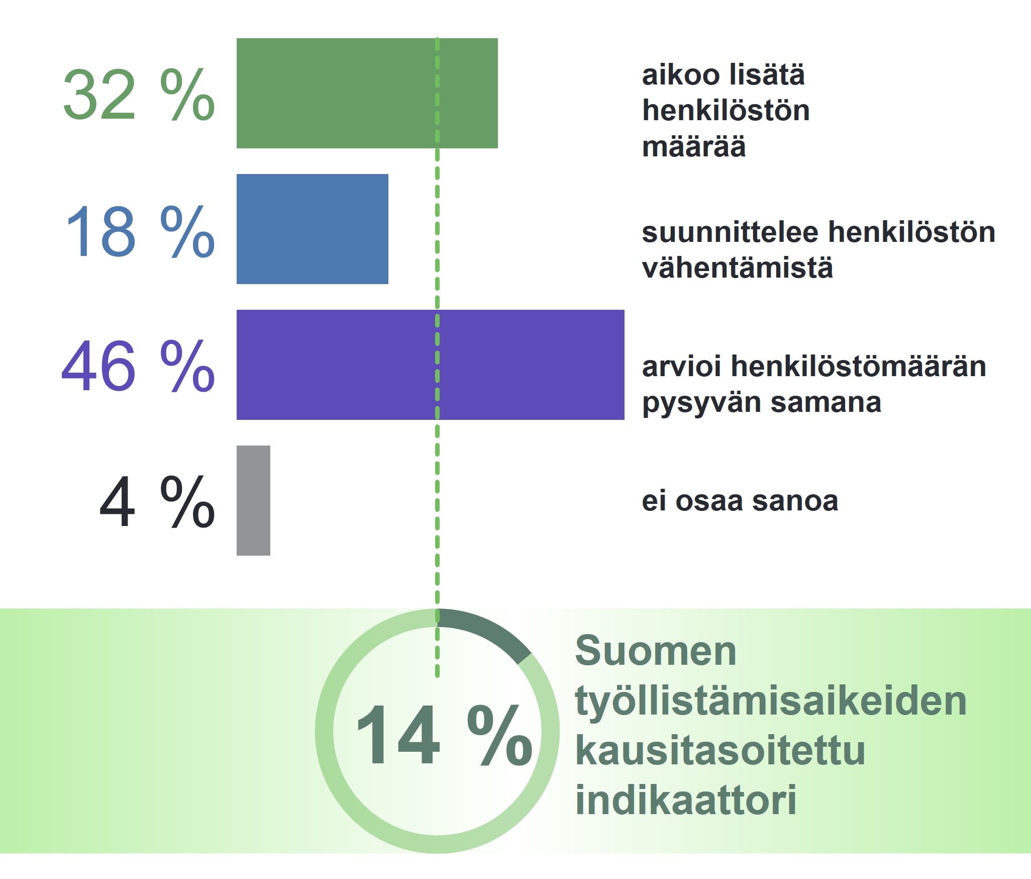 Työnantajien rekrytointiaikeet heikkenevät entisestään. Työnantajien työllistämishalukkuutta kuvaava kausitasoitettu indikaattori on 6 prosenttiyksikköä. Laskua edelliseen vuosineljännekseen on 7 prosenttiyksikköä ja viime vuoden vastaavaan ajanjaksoon 17 prosenttiyksikköä. Globaalisti Suomi sijoittuu työllisyysodotuksissa neljänneksi viimeiseksi, 18 pistettä alle maailman keskiarvon.