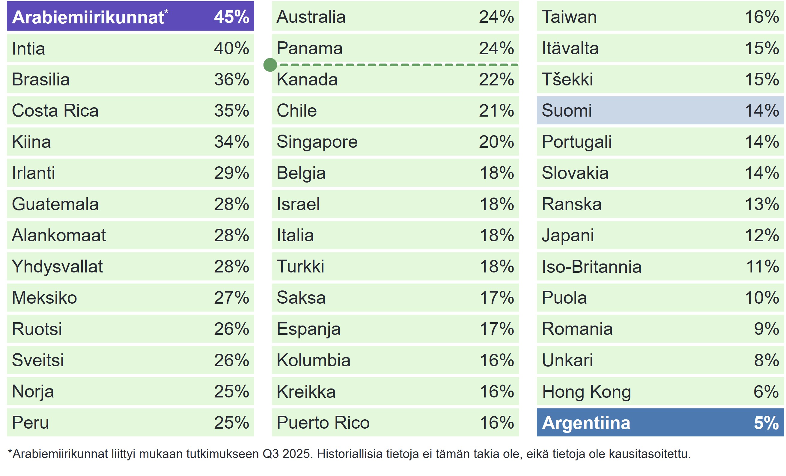 Työmarkkinabarometri: Työllistämisnäkymät heikkenevät entisestään alkuvuonna – Suomi jää globaalissa vertailussa häntäpäähän9.12.2025 08:30:00 EET | Tiedote
