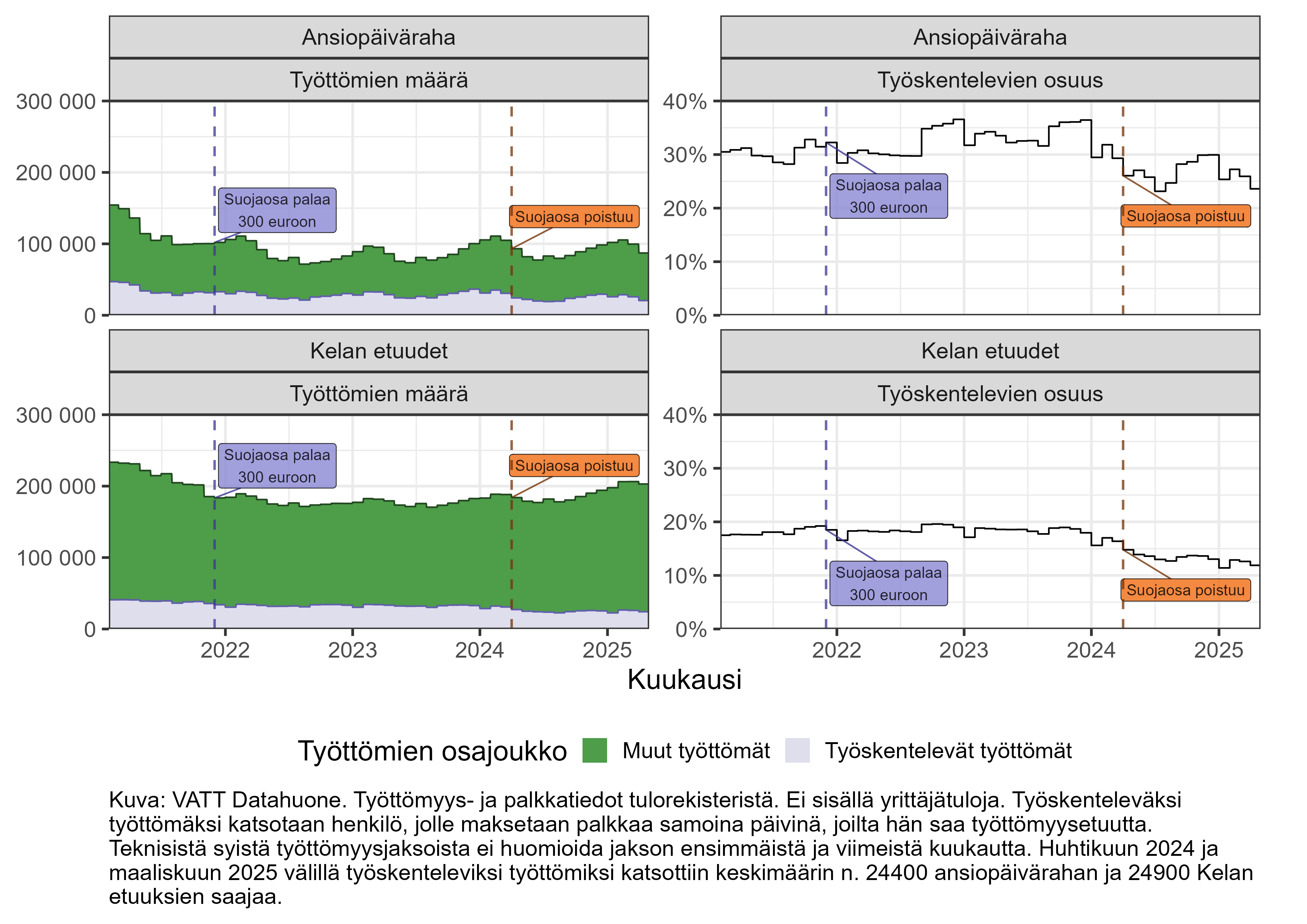 VATT:n tutkijat kävivät läpi kansallisen tulorekisterin, Finanssivalvonnan ja Kelan tietoja, ja huomasivat, ettei osa-aikaisesti työtä tekevien työttömien määrä ole romahtanut työttömyysturvan ja asumistuen suojaosien poistamisen jälkeen. Data näyttää, että osa-aikatyötä tekevien määrä on edelleen selkeästi korkeampi kuin ennen suojaosien voimaantuloa vuonna 2014.
