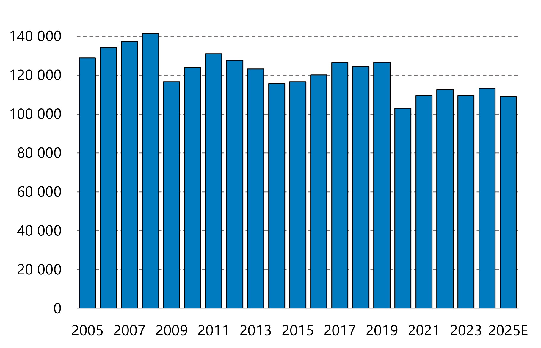 TVK:n ennusteen mukaan palkansaajille sattuu työtapaturma- ja ammattitautivakuutuksesta korvattavia työtapaturmia 109 000 vuoden 2025 aikana. Määrä on nelisen prosenttia vähemmän kuin viime vuonna.