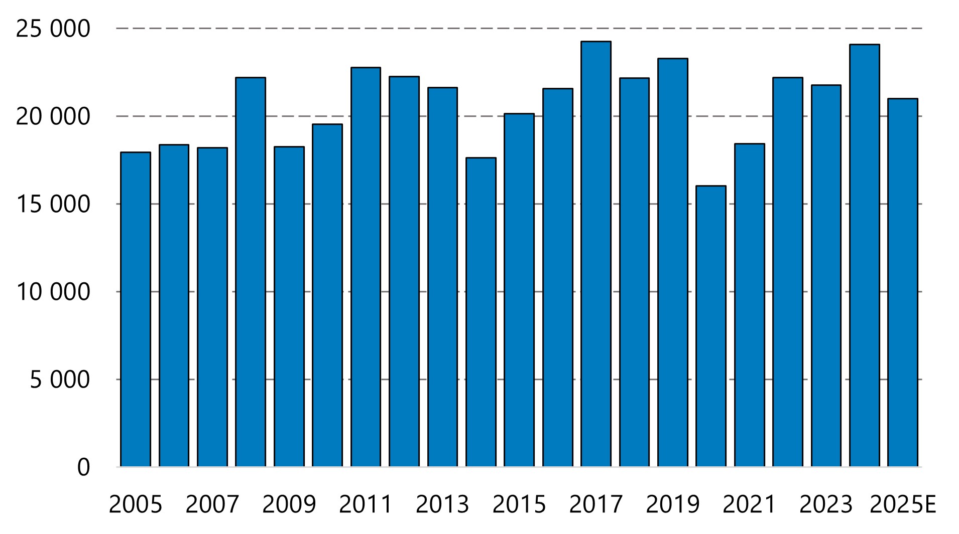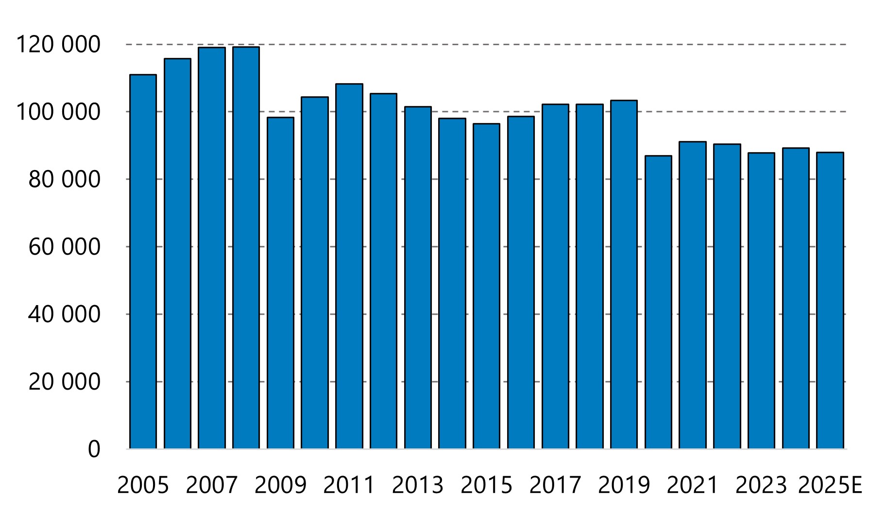 Työpaikkatapaturmien sattumistaajuus pysyy edellisen vuoden tasolla vuonna 2025 arvioidaan TVK:n ennusteessa. Taajuus oli 25 työpaikkatapaturmaa miljoonaa tehtyä työtuntia kohden vuonna 2024, millä tasolla taajuuden oletetaan pysyvän myös tänä vuonna.