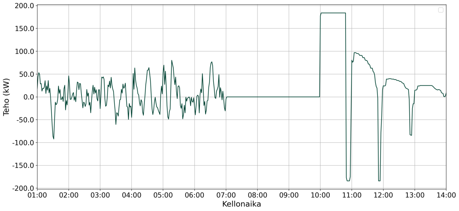 Cactos-akun ollessa reservimarkkinatilassa, akku vaihtelee tiheästi latauksen ja purkauksen välillä, osittaisella teholla (kuvan vasen puolisko). Kuormansiirtotilassa akku sen sijaan lataa tai purkaa sähköä täydellä teholla, maksimoiden ajallisesti siirretyn energian määrän. Tällöin muutoksia latauksen ja purun välillä tapahtuu harvemmin, sillä syklit ajoittuvat spot-hinnan aikaikkunan mukaisesti (kuvan oikea puolisko). Taloudellinen hyöty akkua hyödyntävälle asiakkaalle tulee tällöin ostetun ja myydyn sähköenergian hinnan erotuksesta.