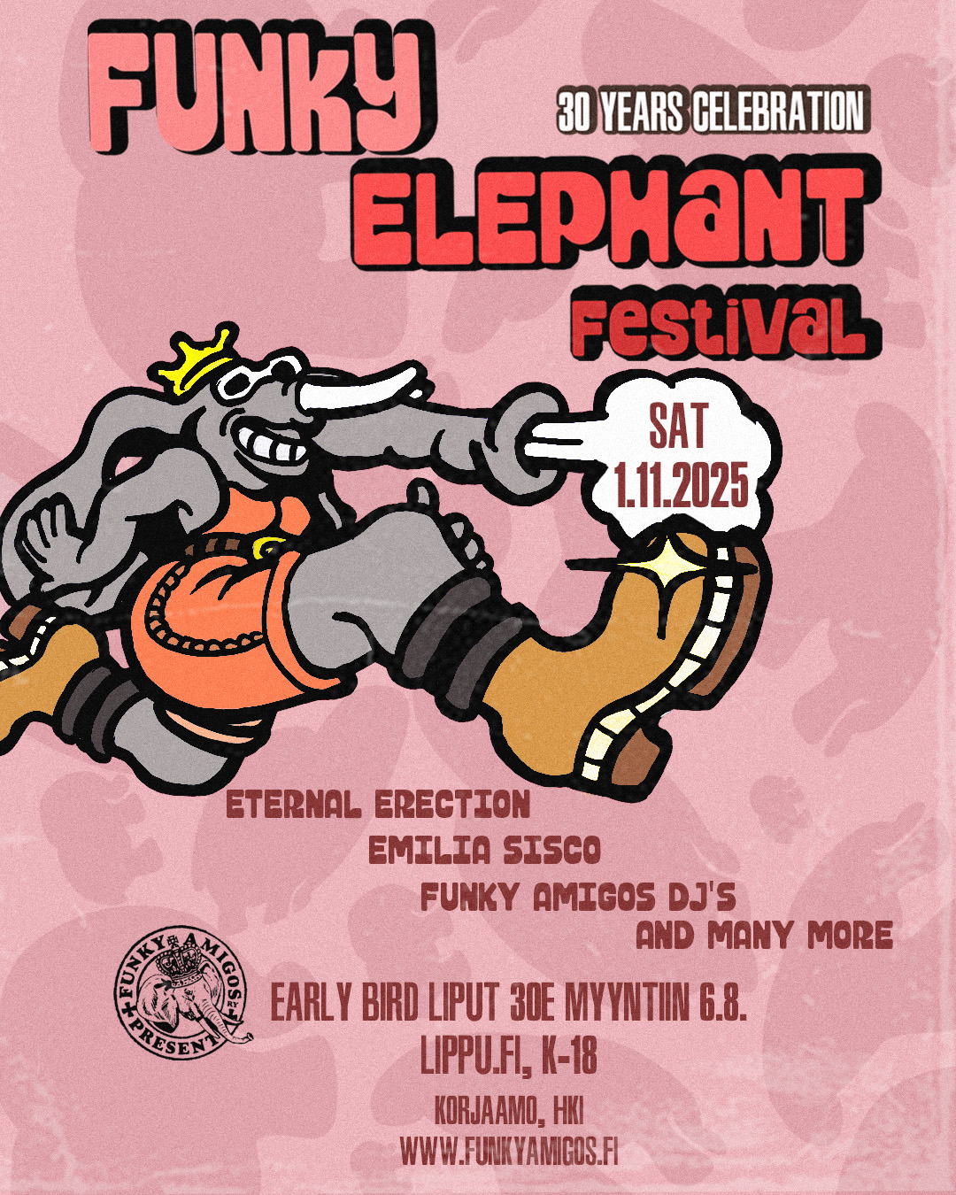 Legendaarinen mustan rytmimusiikin festivaali Funky Elephant järjestettiin ensimmäisen kerran vuonna 1994 Helsingin Tavastialla ja viimeksi kahdeksan vuotta sitten Suvilahdessa. Samana vuonna 1994 Helsingissä perustettu Eternal Erection on yksi suomalaisen funkin uranuurtajista. Vuodesta 2018 keikkatauolla ollut yhtye nähdään nyt ainutlaatuisella comeback- ja juhlakeikalla, jossa kolme vuosikymmentä täynnä funkia ja energiaa levittäytyy kolmelle lavalle.