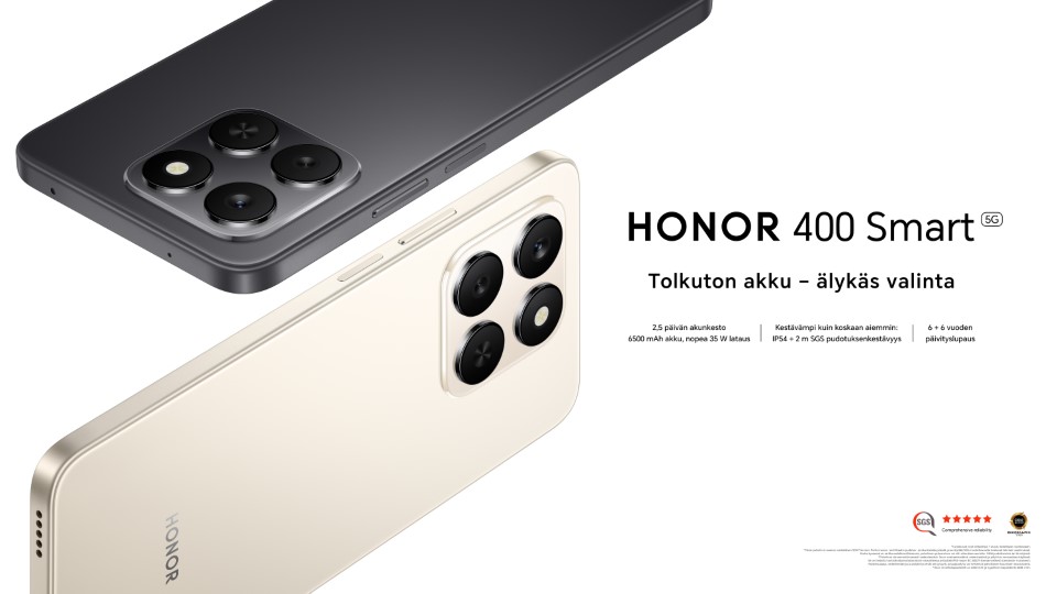 HELSINKI, 11. SYYSKUUTA. Globaali teknologiabrändi HONORin uutuusmalli HONOR 400 Smart tulee Suomessa myyntiin ensi viikolla. HONOR 400 Smart nostaa suorituskykyisten edullisten puhelinten kategorian uudelle tasolle tarjoten paranneltua kestävyyttä ja upouusia tekoälykokemuksia. Puhelimen ominaisuuksiin kuuluu myös viiden tähden pudotuksenkestävyys, IP54 -luokiteltu vedenkestävyys, kestävä ja jättimäinen 6500 mAh:n kaksoiskennoakku sekä kätevä Älykäs AI -näppäin. HONOR 400 Smartin myötä budjettitietoisille kuluttajille on nyt saatavilla käytännöllinen ja monipuolinen älypuhelin, joka sisältää myös kauan toivottuja tekoälyavusteisia toimintoja.