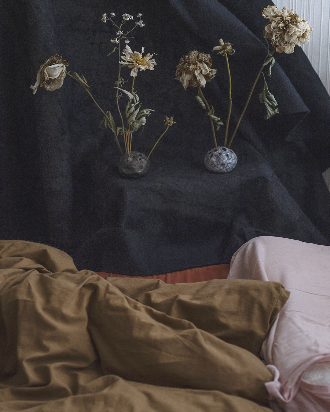 Valon ja varjon välissä syntyi sarja kukkavalokuvia, “iltasatuja”, jotka kumpusivat epävarmuudesta, väsymyksestä ja uuden kodin etsimisen aiheuttamasta turvattomuudesta. Teoksissa yhdistyy kukkien meditatiivinen voima, 1600-luvun maalausperinteestä ammentava visuaalisuus ja surrealistinen tunnelma. Atlas Road 8 on kertomus valosta, epävarmuudesta ja selviytymisestä – sekä siitä, kuinka yksityisestä voi tulla universaalia.