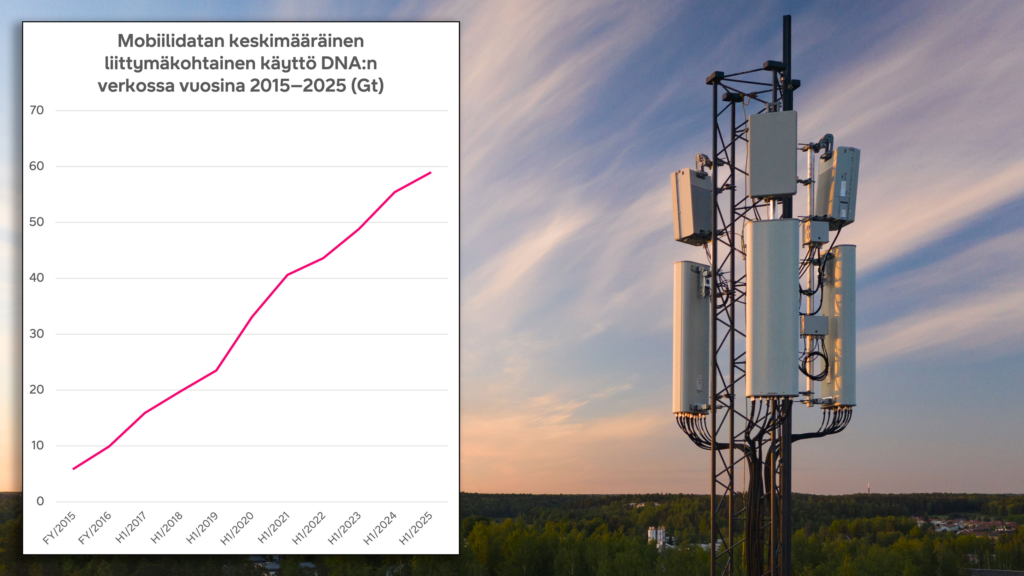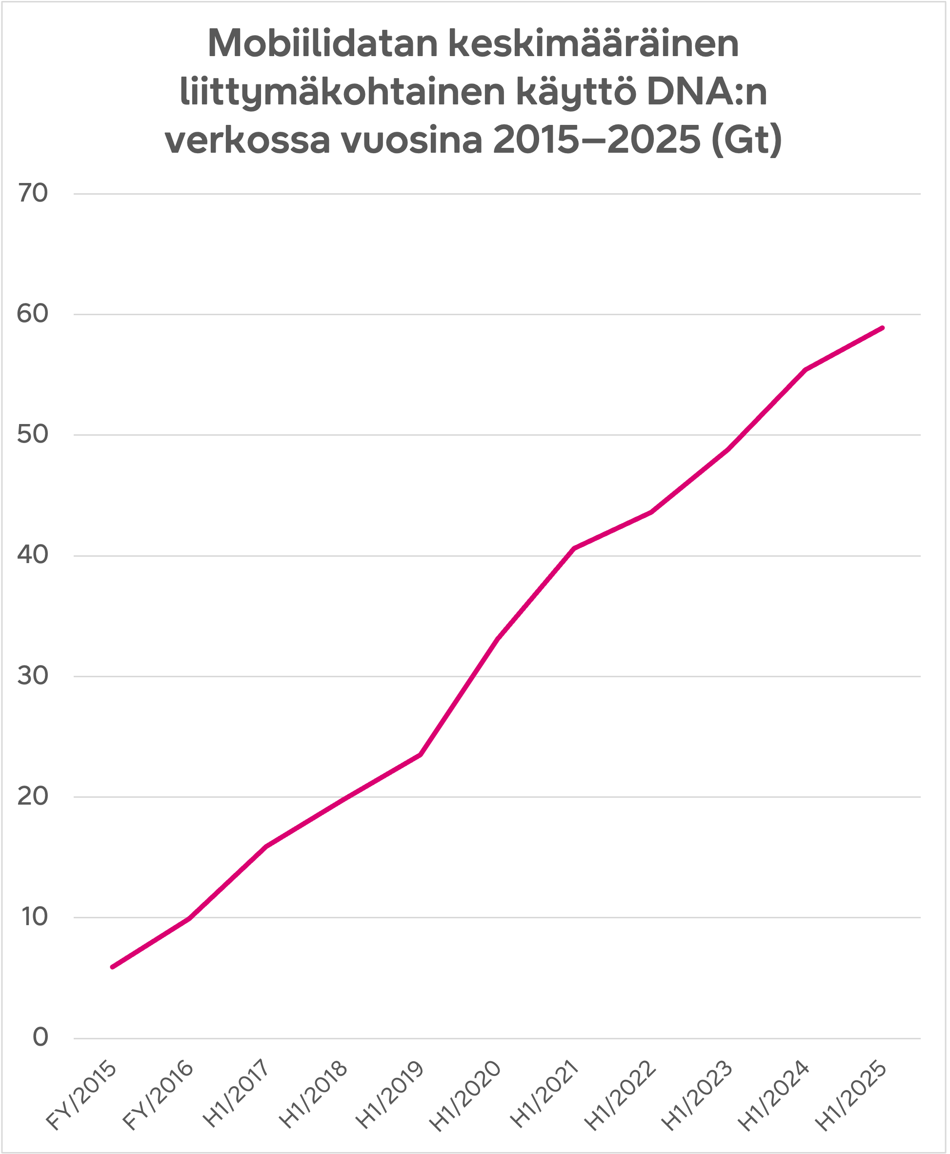 Vuoden 2025 ensimmäisellä puoliskolla DNA:n asiakkaat käyttivät keskimäärin 58,9 gigatavua mobiilidataa kuukaudessa. Vuotta aiemmin vastaava luku oli 55,4 gigatavua. Liittymäkohtainen datamäärä on kasvanut vuodessa siis noin 6 %. Kolmen vuoden aikana kasvua on tullut jopa 35 %, sillä vielä tammi–kesäkuussa 2022 vastaava luku oli 43,6 gigatavua.