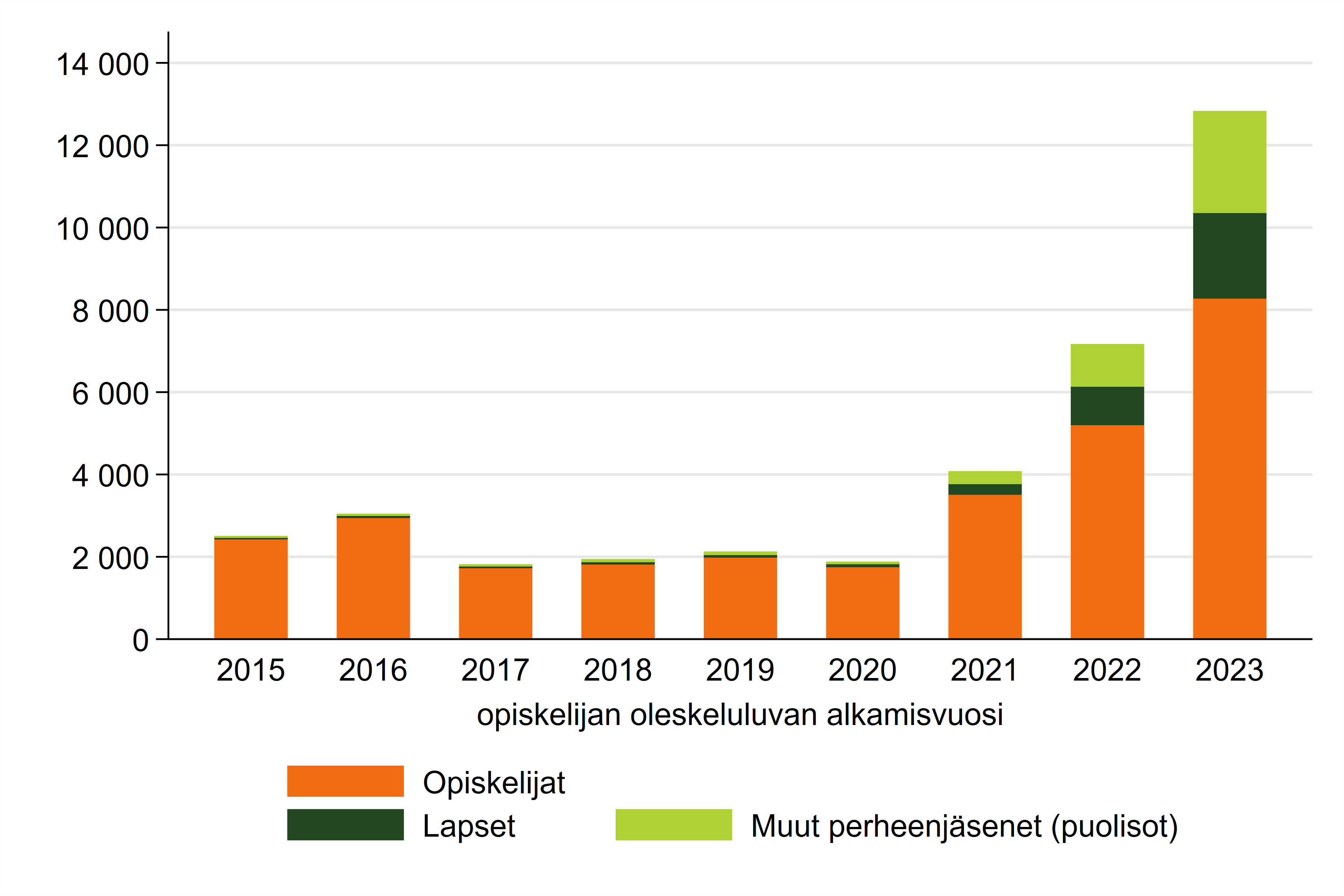 Korkeakouluopintoja varten ensimmäisen oleskeluluvan saaneita oli vuonna 2023 noin 8 000, ja vuoden sisällä näiden lupien alkamisesta noin 4 500 heidän perheenjäsentään oli saanut perheperusteisen oleskeluluvan.