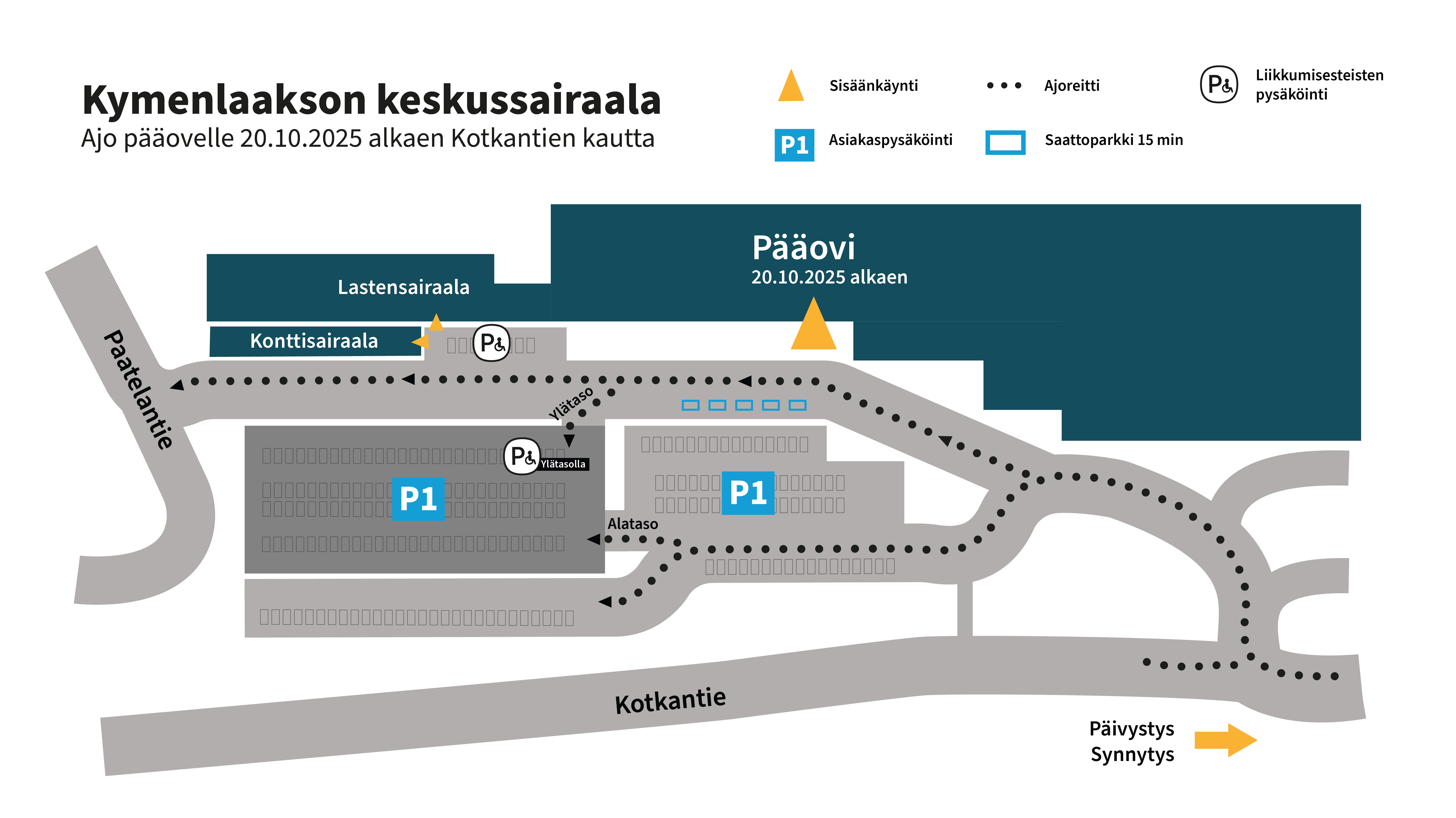 Kymenlaakson keskussairaalan uusi pääovi otetaan käyttöön maanantaina 20.10.2025 kello 6. Uuden pääoven nauhanleikkuutilaisuus järjestetään kello 9.