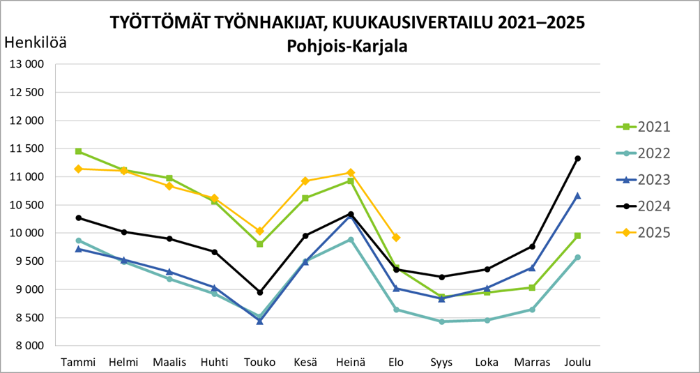 Pohjois-Karjalassa oli elokuun lopussa 9 921 työtöntä työnhakijaa, joista 417 oli lomautettuna. Vuoden takaiseen verrattuna työttömiä oli 564 henkilöä enemmän (6 %) ja lomautukset vähentyivät 40 henkilöllä ( 9 %).