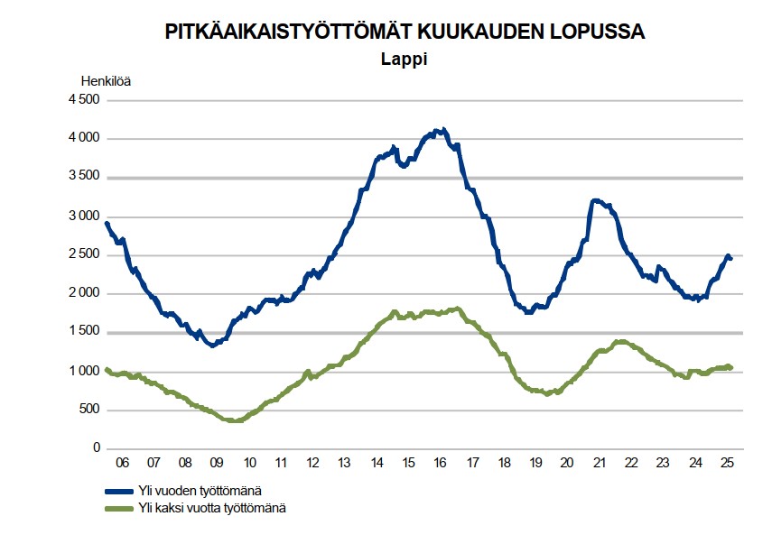 Työttömyydet ovat pitkittyneet myös Lapissa ja pitkäaikaistyöttömyys on kasvussa. Elokuussa Lapin työttömistä lähes joka kolmas (koko maa 42 %) oli ollut työttömänä yhdenjaksoisesti yli vuoden. Pitkäaikaistyöttömiä oli 530 enemmän kuin viime vuoden elokuussa. Erityisesti 1–2 vuotta työttömänä olleita on viimevuotista enemmän, sen sijaan yli kaksi vuotta työttömänä olleiden määrässä kasvu on vähäistä. Koko maassa pitkäaikaistyöttömyys on lisääntynyt Lappia voimakkaammin.