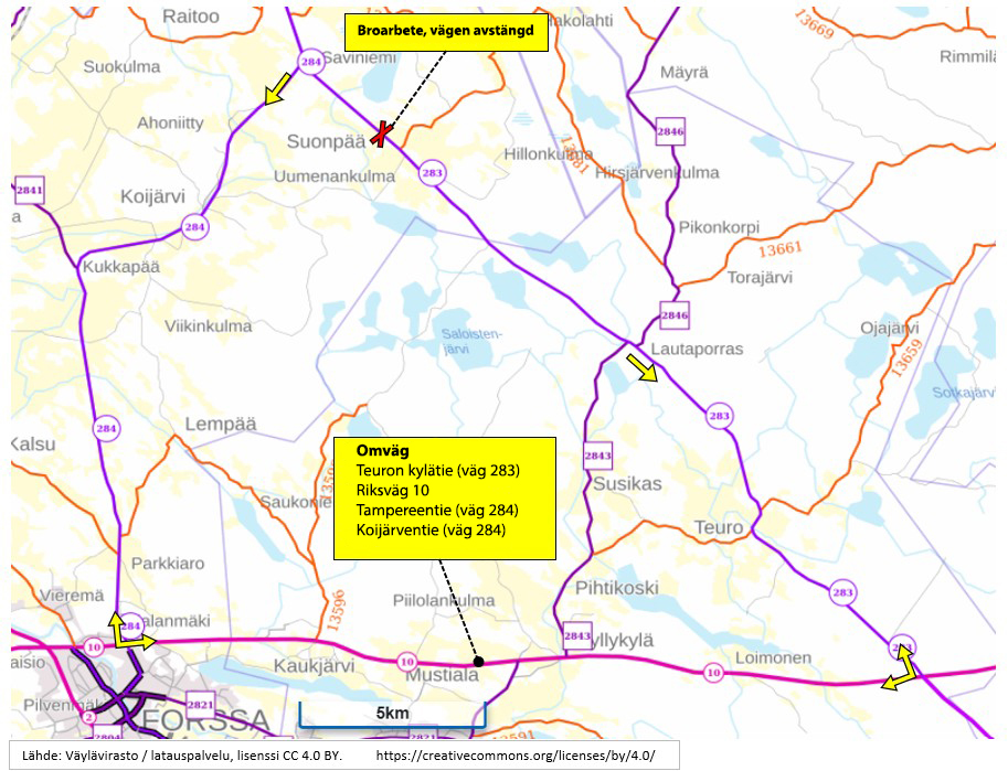 Saviniementie (väg 283) i Suonpää i Forssa stängs för trafik medan Kiluoja bro förnyas. Under arbetet dirigeras trafiken till en omväg.