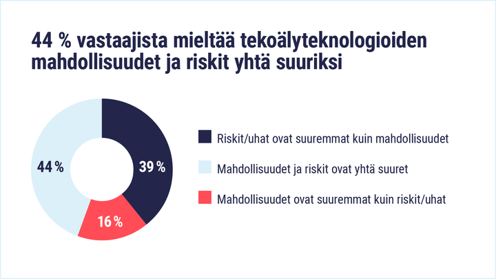 Lähes neljä kymmenestä vastaajasta pitää tekoälyyn liittyviä riskejä suurempina kuin sen mukanaan tuomia mahdollisuuksia. Vastaajia huolettaa muun muassa teosten käyttö tekoälymallien koulutusdatana ilman lupaa tai korvausta sekä sisältöjen plagioinnin lisääntyminen. Suurimpiin uhkiin kuuluu tulojen heikentyminen etenkin pitkällä aikavälillä – näin uskoo tapahtuvan 54 % tekijävastaajista ja 48 % kustantajavastaajista.