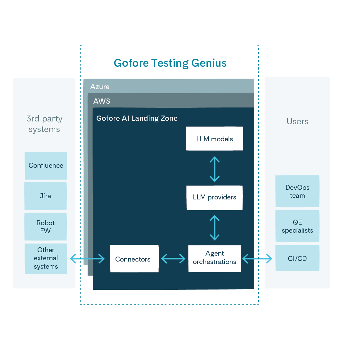 Gofore Testing Genius is a cloud-based service based on artificial intelligence. In it, a testing solution suitable for each use case is built into the customer's operational environment, where AI supports the work of human testers. Testing Genius automates processes, workflows, information retrieval, and data generation with the help of AI agents. The service can be flexibly and agilely tailored to meet the customer's needs as an AI and automation-driven solution.