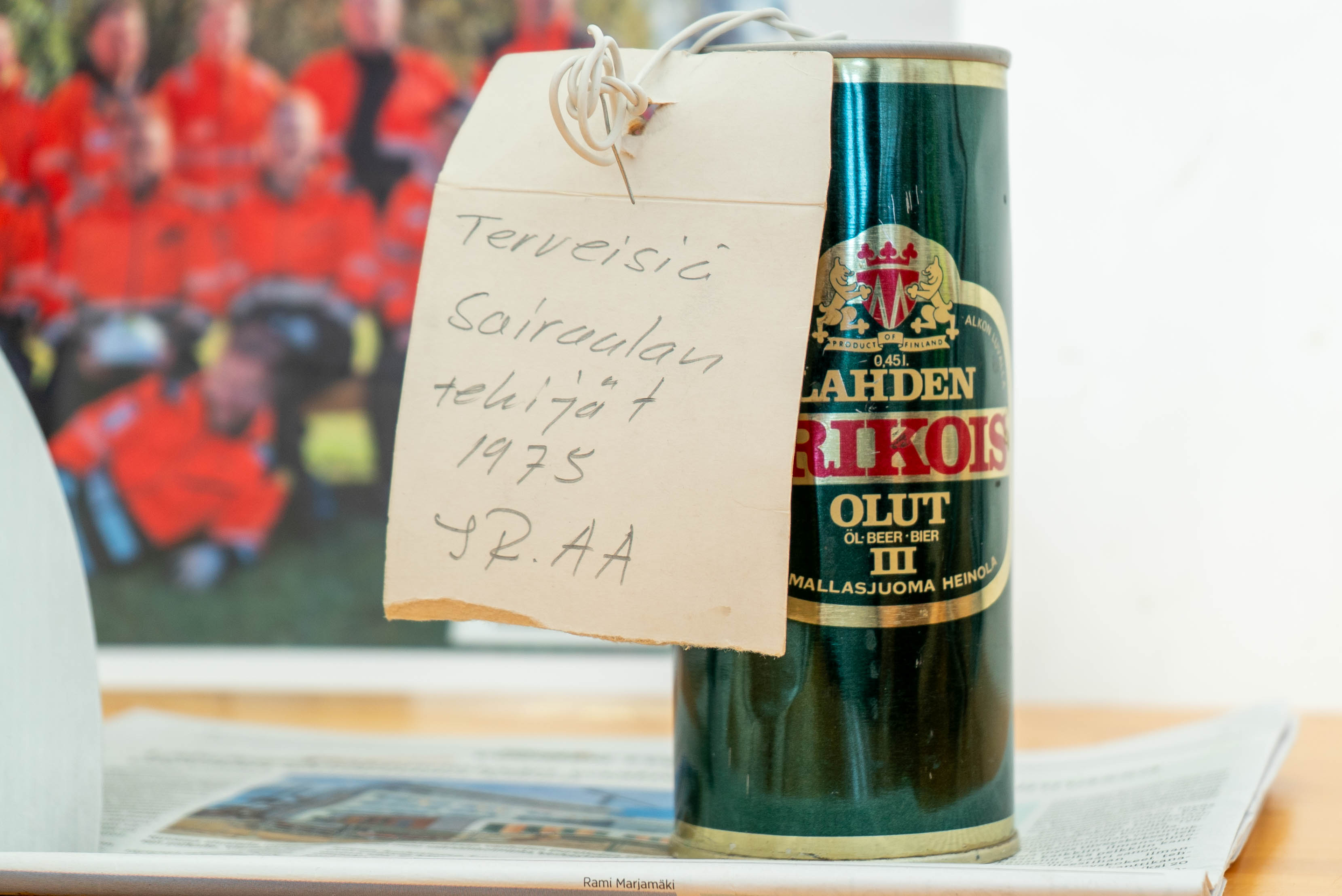 Puretun rakennuksen kivijalasta löytynyt oluttölkki vuodelta 1975. Tölkkiin on sidottu lappu, jossa on tervehdys sairaalan rakentajilta.