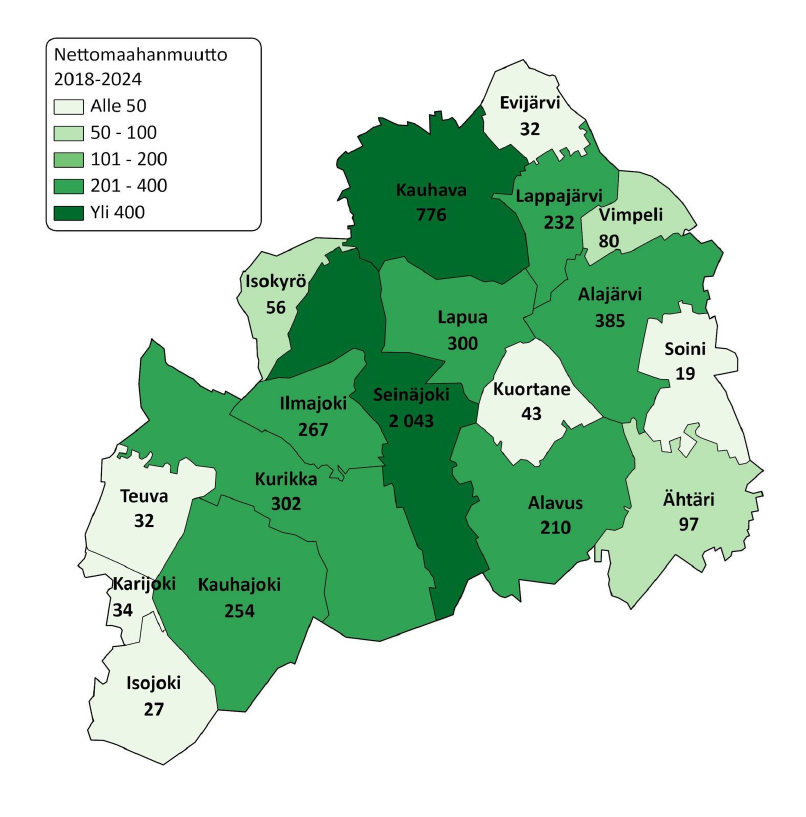 Maan sisäisestä muuttoliikkeestä Etelä-Pohjanmaa kärsi tarkastelujakson aikana muuttotappiota yhteensä 4 885 henkilöä. Muuttotappiota tuli jokaisena vuotena, mutta alueen nettomaahanmuutto oli sen sijaan positiivista samalla ajanjaksolla. Viime vuosina muuttovoittomäärät ovatkin kasvaneet merkittäväsi aikaisempiin vuosiin verrattuna. Nettomaahanmuuton kasvun taustalla on ollut ukrainalaisten kotikuntavalinnat sekä työ- ja koulutusperäisen maahanmuuton lisääntyminen.