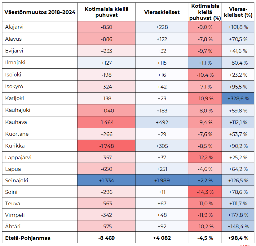 Etelä-Pohjanmaan ELY-keskuksen MDI:ltä hankkima raportti maahanmuuton tilannekuvasta Etelä-Pohjanmaalla on valmistunut. Vaikka vieraskielisen väestön määrä on kasvanut Etelä-Pohjanmaalla merkittävästi, olemme yhä jäljessä kansainvälistymisessä muuhun maahan verrattuna. Samalla alueen kokonaisväkiluku jatkaa laskuaan.