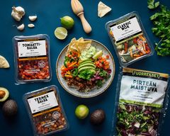 Tuorrekset tuotteita pöydällä, kuten salaattisekoitus, tomattisalsa ja thaikasvikset.