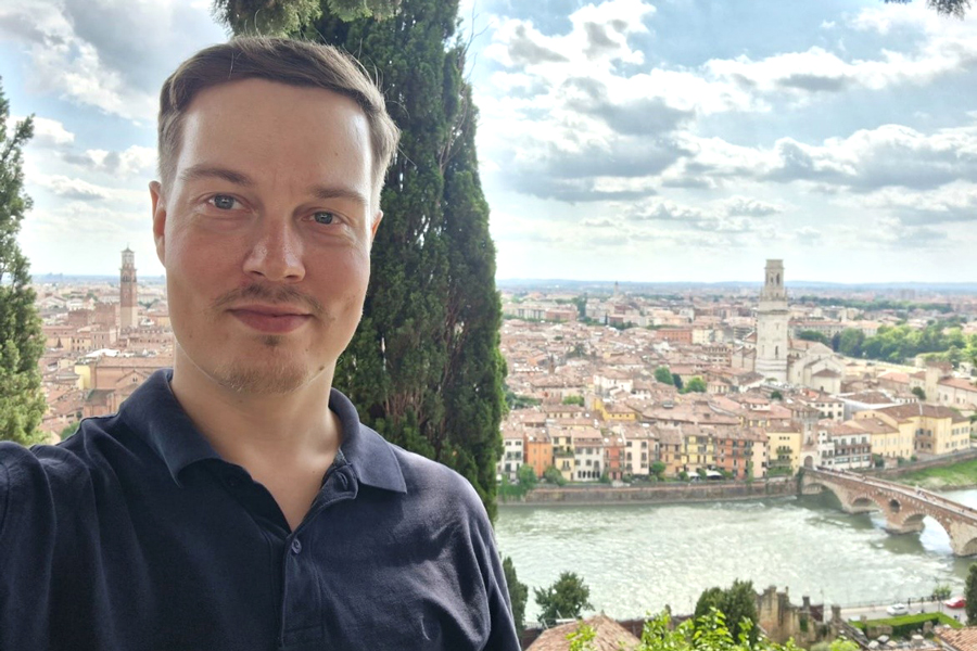Joona Vaara poseeraa taustallaan eurooppalainen vanhakaupunki.
