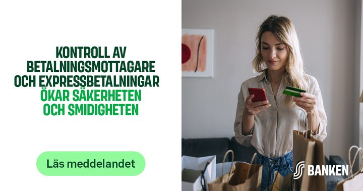 I S-Bankens digitala tjänster införs kontroll av betalningsmottagare, vilket ytterligare ökar säkerheten hos banktjänsterna. Syftet med kontrollen är att förhindra att betalningar hamnar hos fel mottagare, till exempel på grund av mänskliga inmatningsfel. Tanken är också att kontrollen ska bidra till att minska antalet bedrägerier.