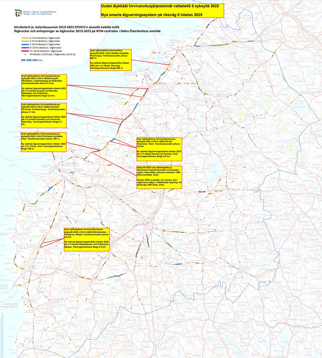 Trafiksäkerheten på riksväg 8 i Österbotten fortsätter att stärkas. I år görs igen satsningar på smarta varningssystem. Utöver det får lokala jaktvårdsföreningar nya säkerhetsredskap och för trafikanter har det lanserats en helt ny viltvarnignsapplikation. I oktober ordnas dessutom en viltvarningsturné i regionen. I samarbetet medverkar NTM-centralen i Södra Österbotten, Finlands viltcentral samt lokala jaktvårdsföreningar, LokalTapiola Österbotten och InnoTrafik Oy.